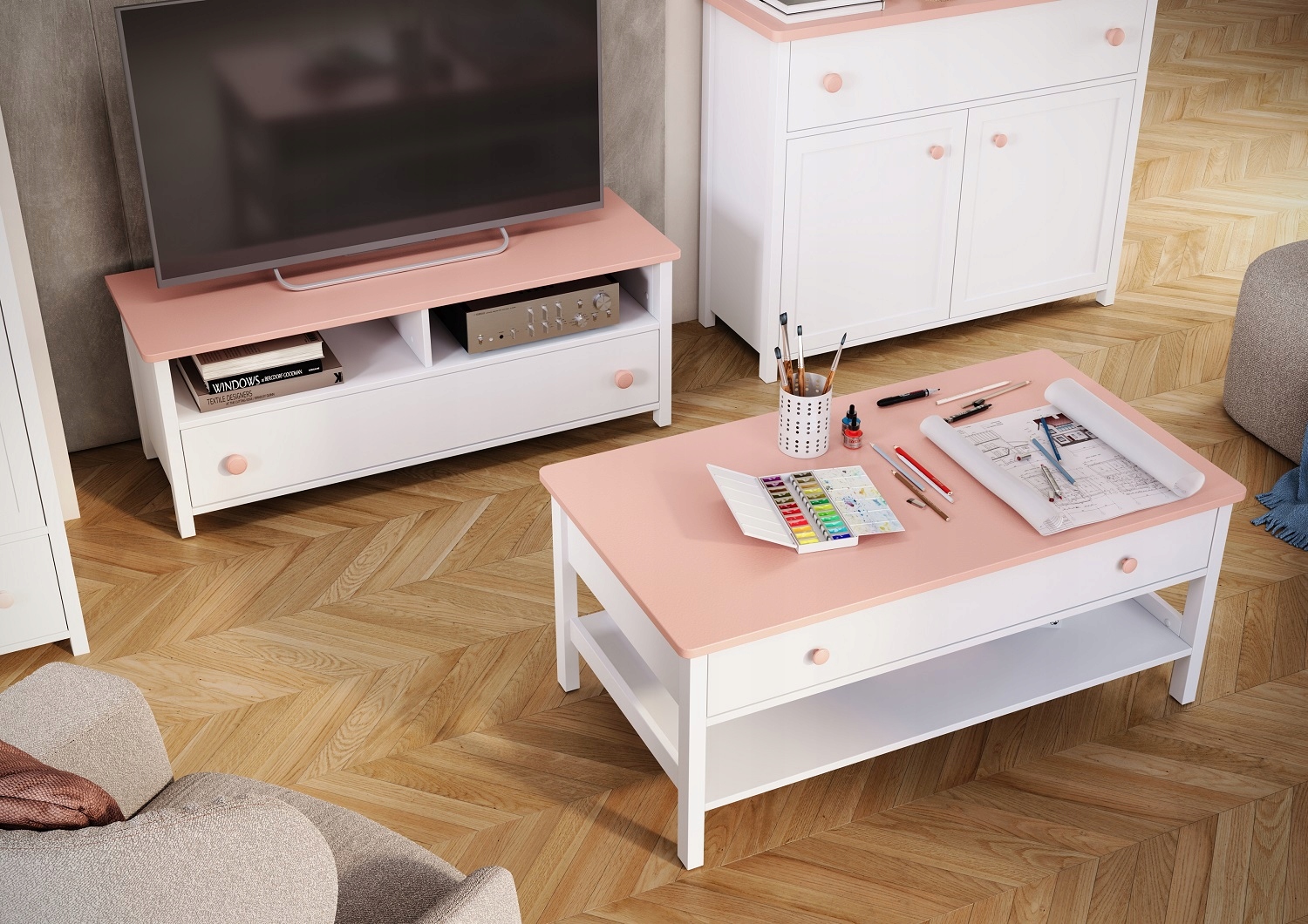 Тумба под ТВ для девочек белый / розовый