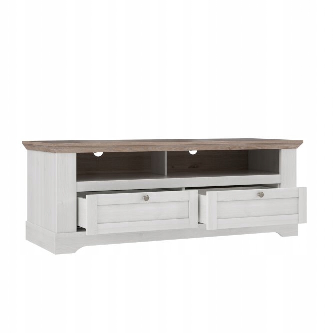 Шкаф под ТВ из этой коллекции прекрасно впишется в обустройство гостиной или гостиной. Практичный предмет мебели выполнен из комбинации светлого дуба Сноу и дуба Нельсона. Шкаф имеет две открытые полки и два самозакрывающихся ящика.