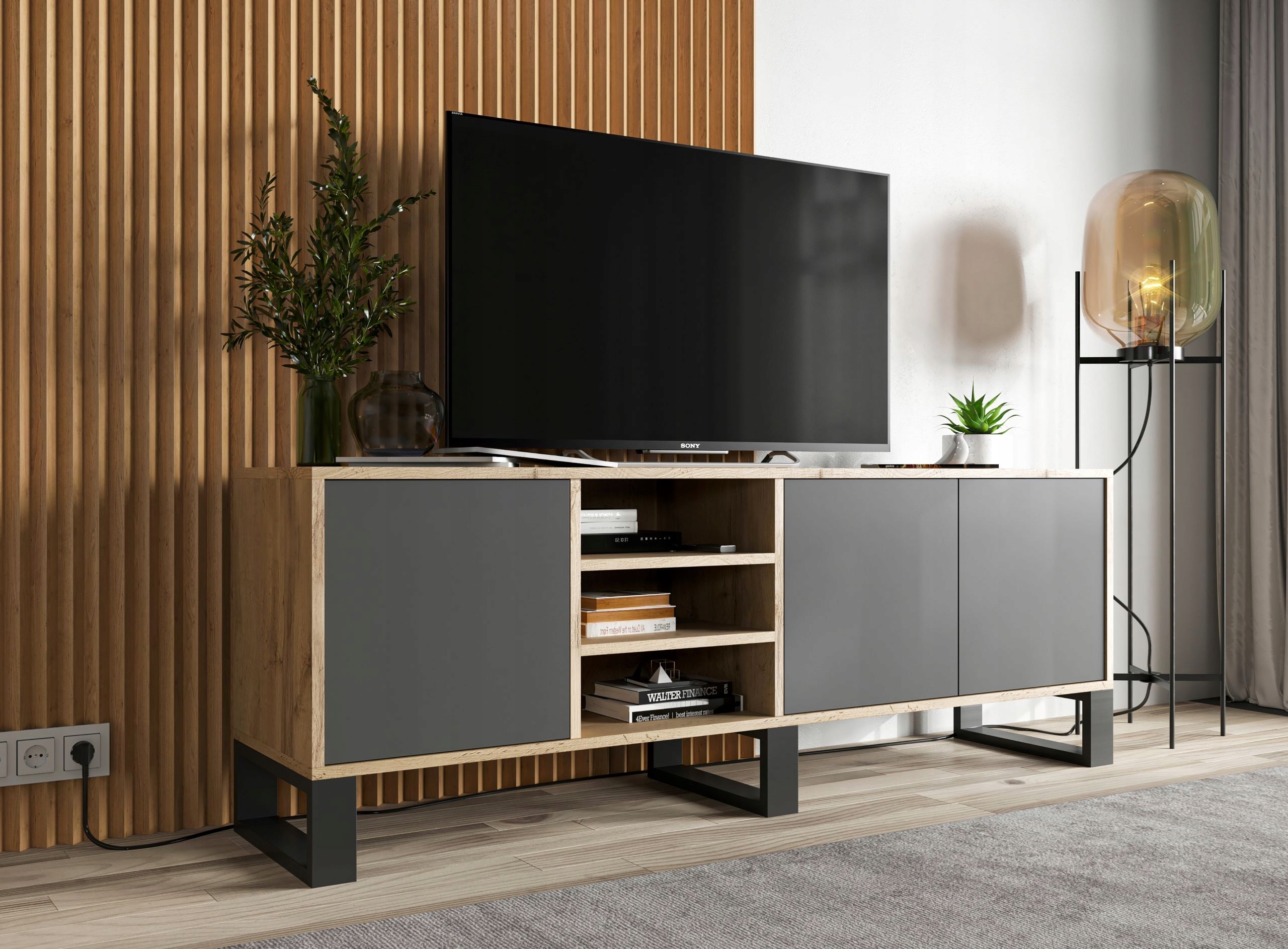 Универсальный напольный шкаф в стиле лофт, идеально подходящий для размещения телевизора и вписывающийся в любой интерьер. Он имеет две закрытые камеры, разделенные на два уровня, и одну открытую камеру - три уровня. Удобная система открытия двери push to open.
