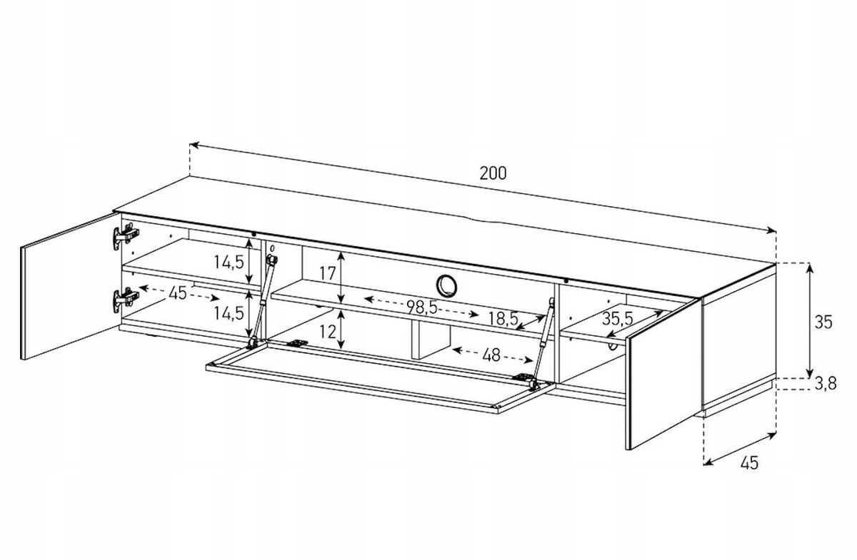 Это делает открытие и закрытие бесшумным и незаметным. Такое решение позволяет сделать шкаф полностью без ручек, что придает ему элегантность и облегчает поддержание чистоты шкафа. Нижняя часть шкафа отделана цоколем, что придает шкафу элегантность и в то же время скрывает скрытые внутри ролики (колеса), позволяя шкафу свободно перемещаться. Ширина 200 см, предназначена для телевизоров с диагональю до 90 дюймов.