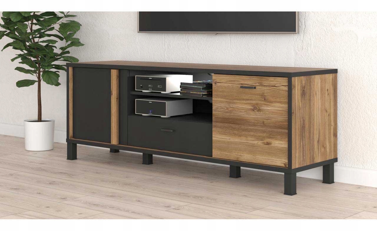 Приглушенные землистые тона коллекции HAYATO - декор альпийской ели в слегка необработанном варианте и глубокий черный цвет - создают уникальный контраст цвета. Такое сочетание прекрасно впишется в индустриальный лофт, интерьер, оформленный в духе японского минимализма, а также классическое пространство. Мебель лишена вычурных украшений. Только длинная вертикальная ручка, идущая по всей высоте фасада, является декоративным элементом, и это очень практичное решение, поскольку мы можем взять ее где угодно. В коллекции сочетается все необходимое для создания комфортной гостиной и обеденной зоны.