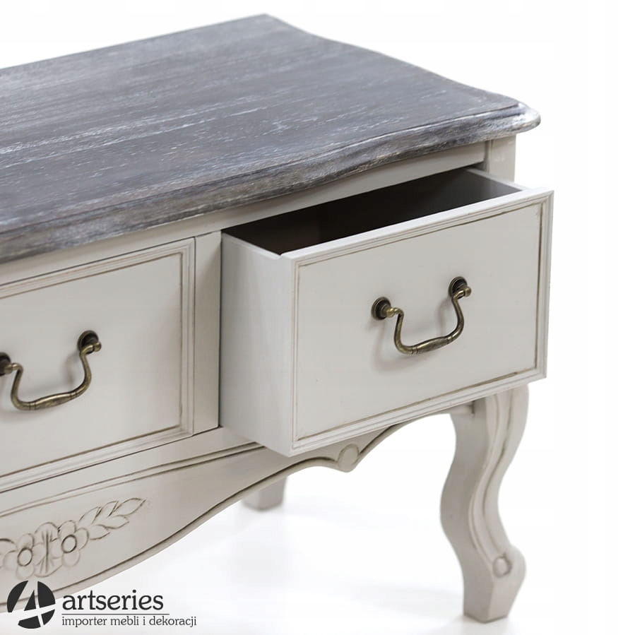 Шкаф Провансаль с тремя ящиками для гостиной. Сделано из дерева; потертый верх, темнее корпуса, оттенка темного графита. Все это украшено тонкой резьбой. Ручки ящиков в форме наковальни. Предмет мебели можно использовать как журнальный столик.