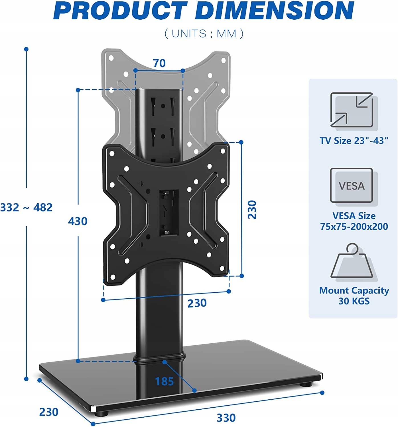 - 【СТАБИЛЬНОСТЬ】 - Сменная подставка для телевизора изготовлена из прочной сверхпрочной стали и имеет основание из закаленного стекла толщиной 8 мм, что обеспечивает безопасность и устойчивость при установке телевизора весом до 30 кг. Два предохранителя в монтажных кронштейнах предотвращают неожиданное перемещение телевизора.
