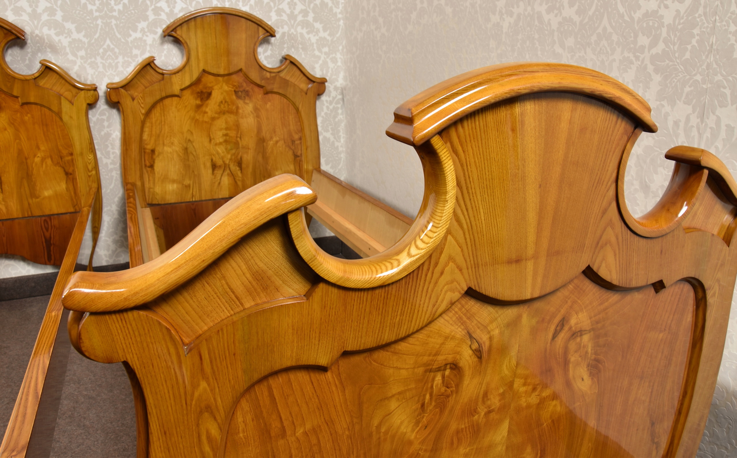Кровать и шкаф изготовлены путем облицовки ясенем и корнем вяза. на структуре ясеня и хвойной древесины. Все это было покрыто шеллаком, нанесенным вручную до зеркального блеска с закрытыми порами. Цвета до ремонта были сохранены, что прекрасно подчеркивает текстуру дерева.