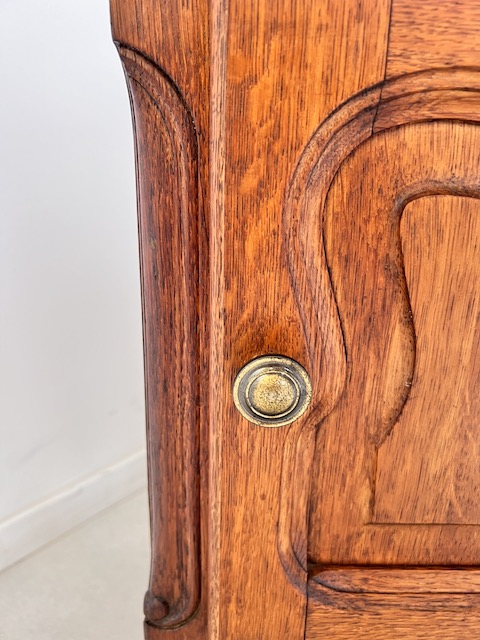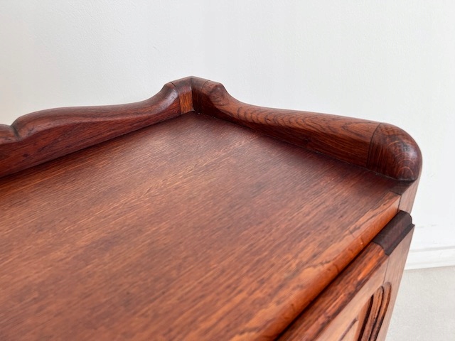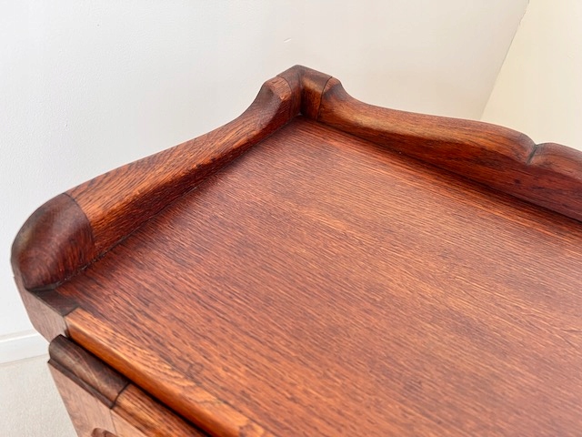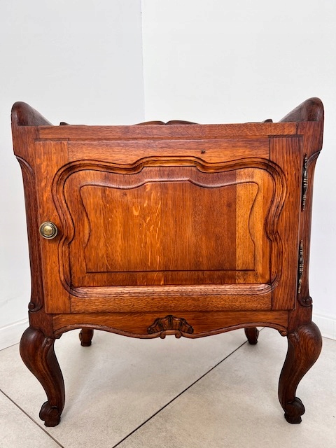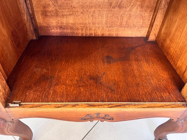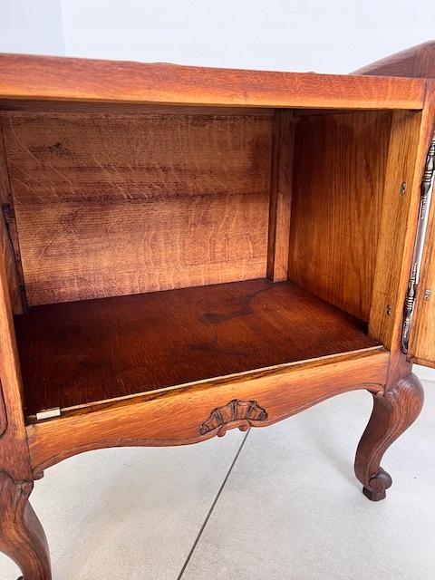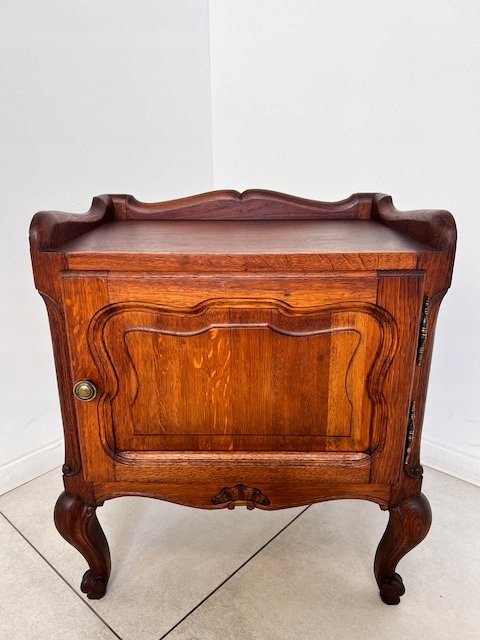 Прикроватная тумбочка выполнена в стиле Людвик. Хорошая модель. Вокруг столешницы с трех сторон имеется высокий бортик. Он находится в хорошем состоянии. Повреждений и дефектов нет. Имеет типичные следы использования. Стол готов к установке.