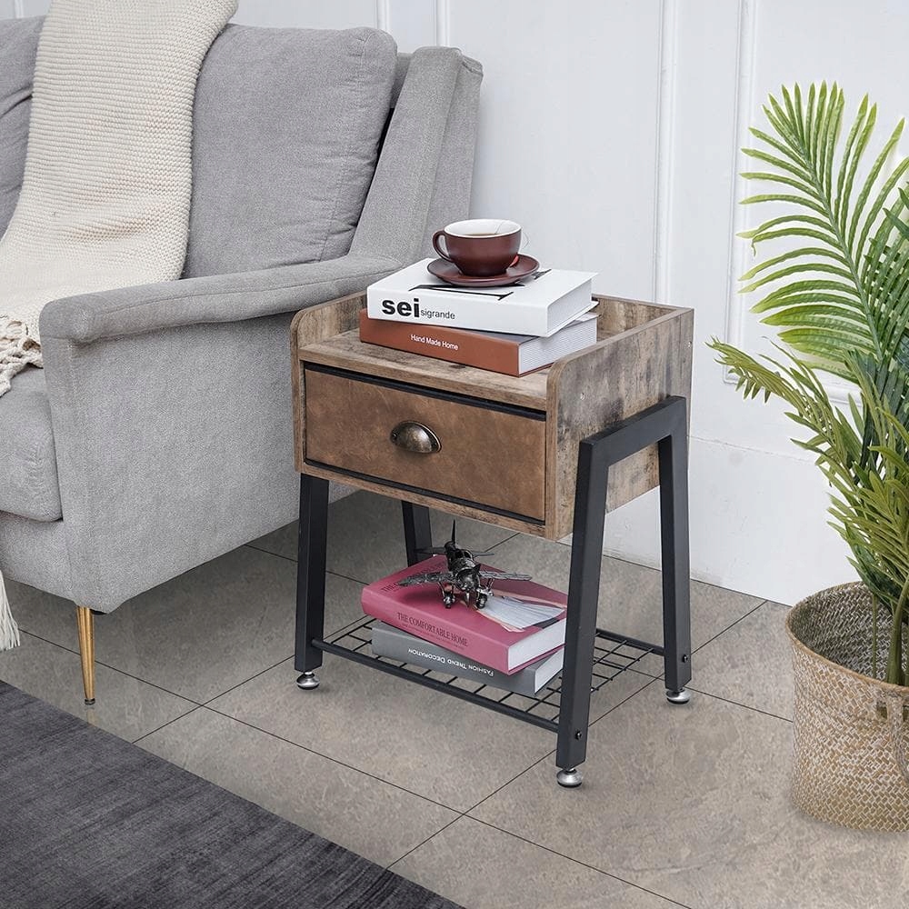 Использование винтажного промышленного дизайна достигается за счет отделки из черного металла под старину и столешницы под старину. Придает прикроватной тумбочке с ящиками простой и просторный вид с четкими линиями, привнося элегантность и деревенский стиль в ваше домашнее пространство.