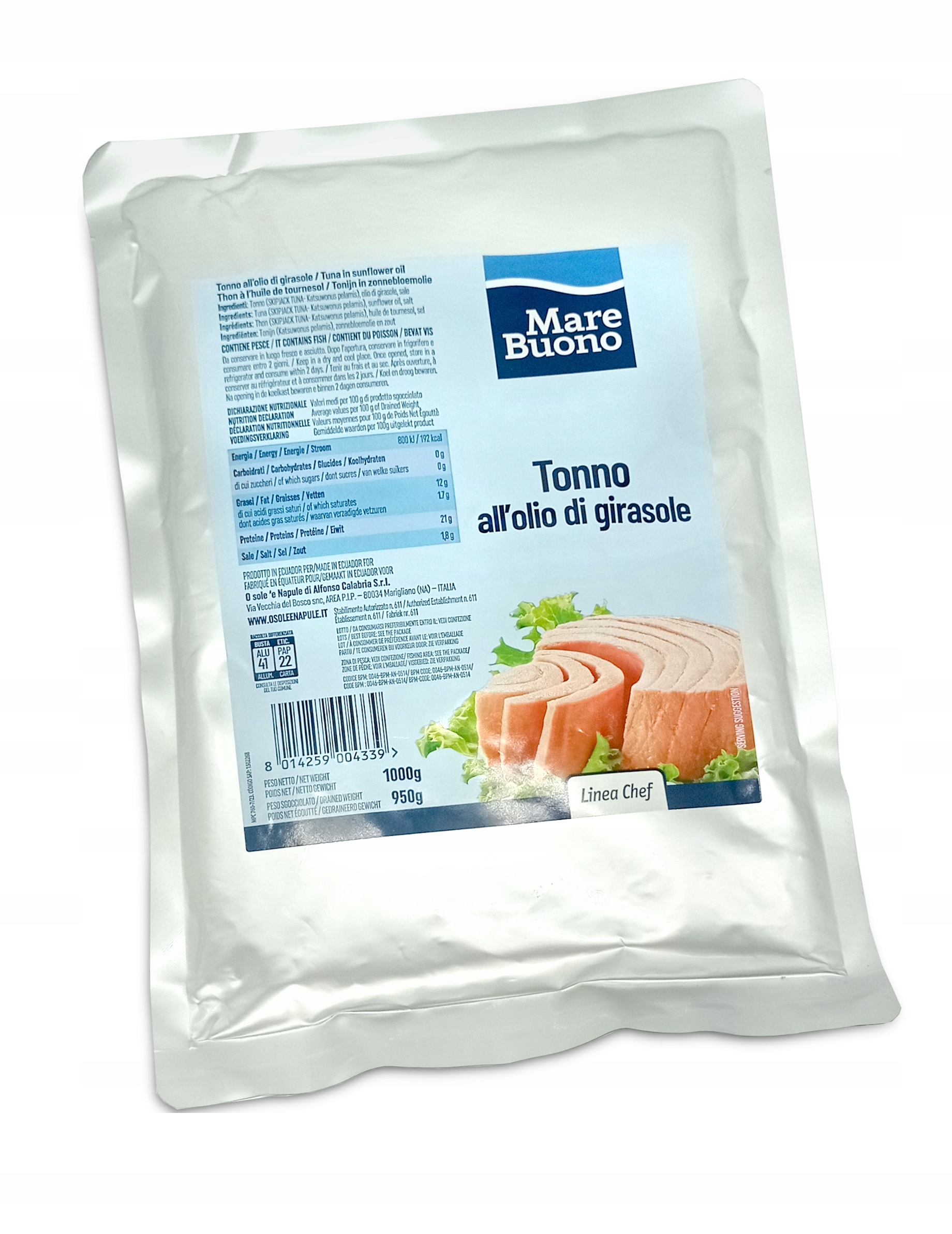 MARE BUONO TONNO ALL'OLIO DI GIRASOLE ТУНЦ В ПОДСОЛНЕЧНОМ МАСЛЕ LINEA CHEF 1000г