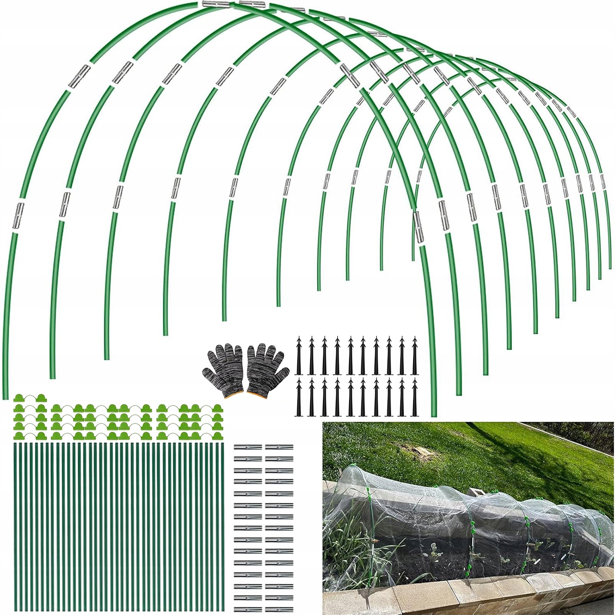 【луки в пластиковые туннели】 Продукты содержат 40 кусочков стекловолокно с длиной 38 см, 20 территорий с длиной 10,5 см, 25 дисков, 25 двойных зажимов для парниковой фольги и 1 пары перчаток. Волокна стеклянной кривой садового туннеля покрыты зеленым пластиком, который является гибким и не ломается легко. Съемная структура сохраняет пространство и подходит для повторного использования.