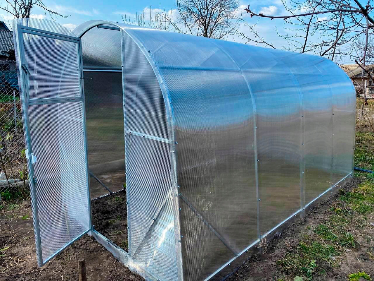 Также возможно покрытие теплицы качественным поликарбонатом толщиной 4 мм, плотностью 0,55 кг/м2 или 6 мм (0,9 кг/м2), благодаря чему он будет теплее и прочнее. Вы можете купить теплицу с фольгой и через несколько лет заменить фольгу поликарбонатом. Наш технический консультант подберет подходящие материалы для теплицы.