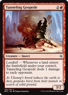 Выход на берег — каждый раз, когда земля выходит на поле битвы под вашим контролем, Туннельная геопеда наносит 1 повреждение каждому оппоненту.