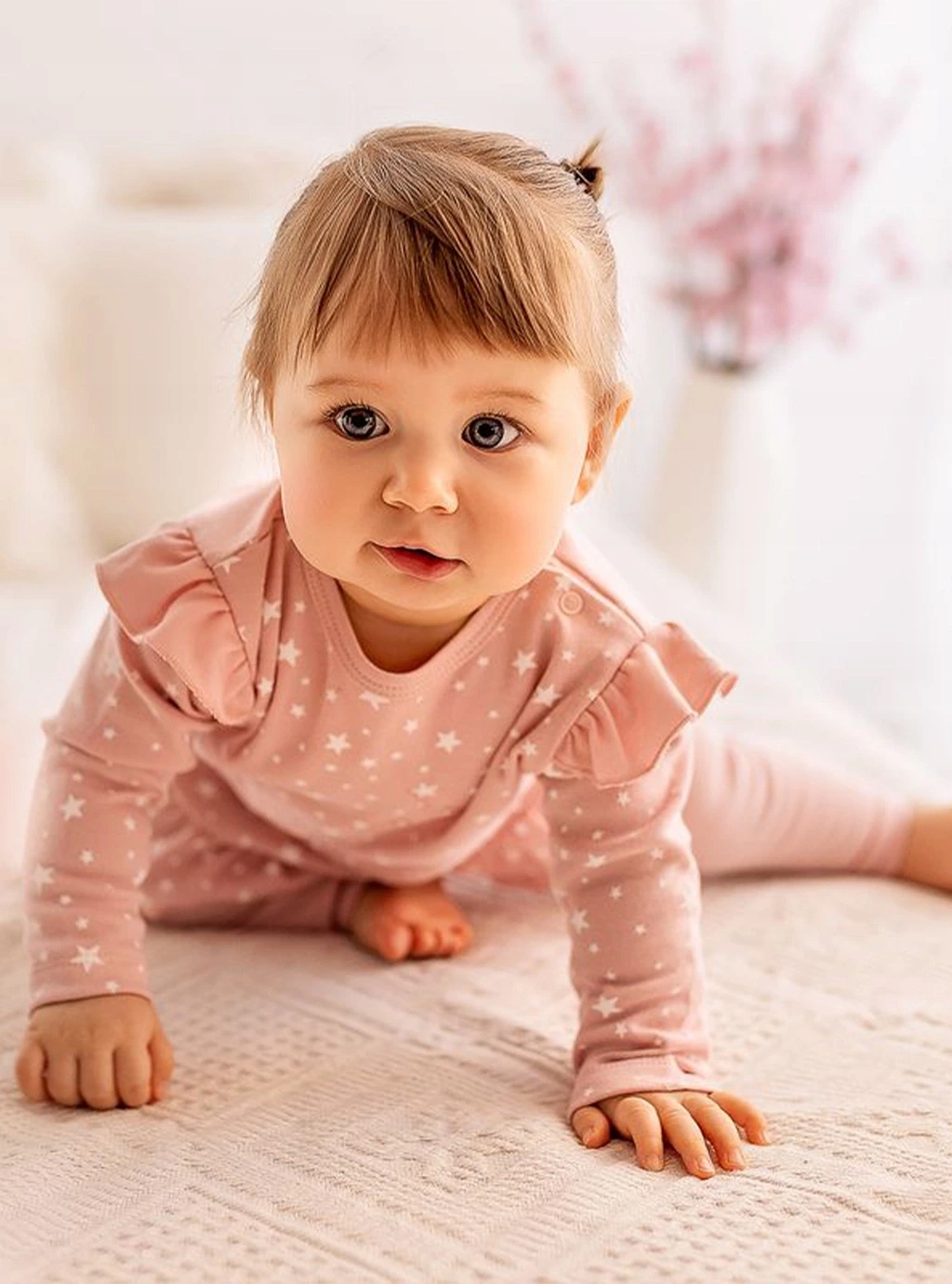 Пудрово-розовая туника прекрасно сочетается с одеждой из коллекции Stars в этом цвете, что позволяет свободно комбинировать их в связные множества. Кроме того, универсальная туника хорошо сочетается с любой одеждой новорожденного.