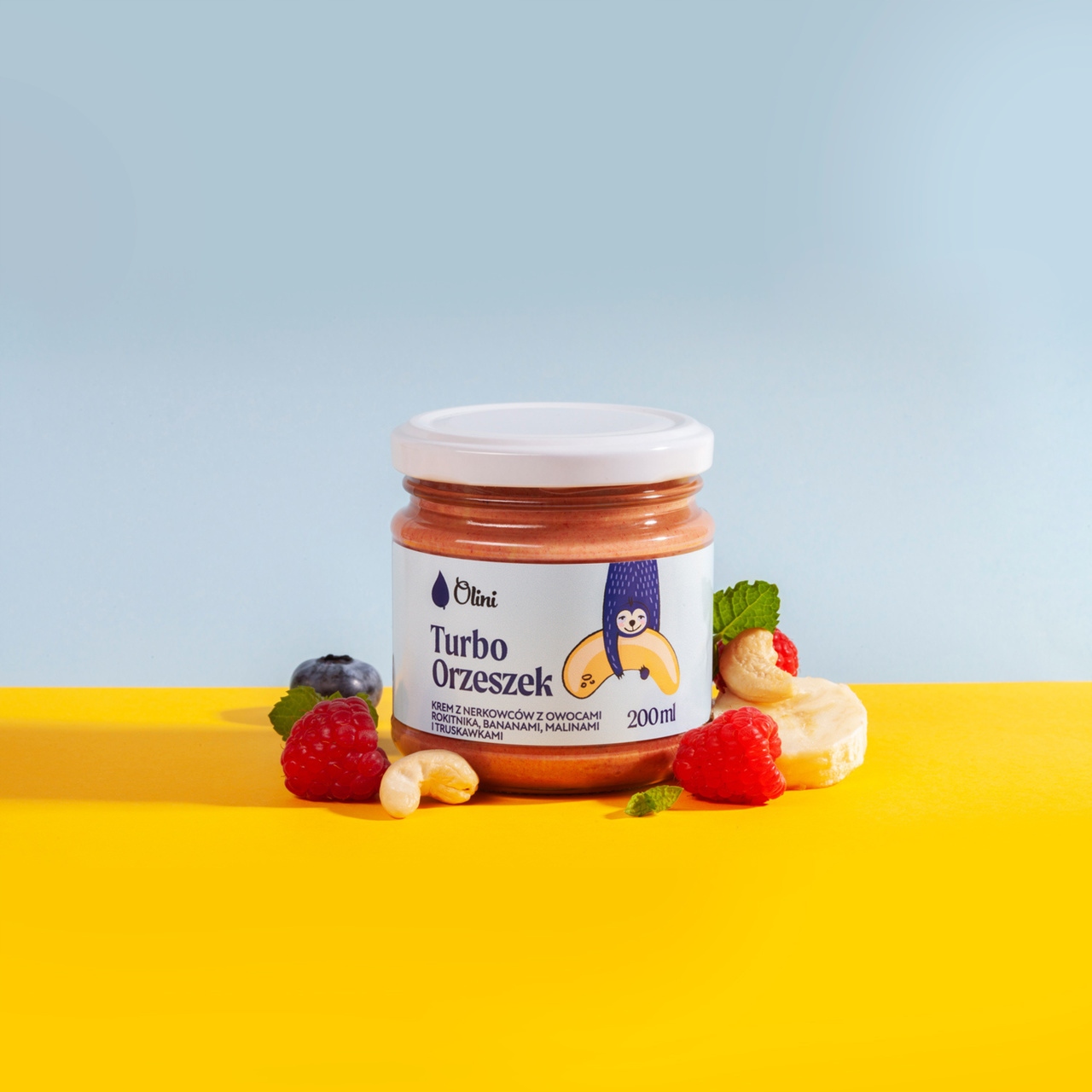 Созданный специально для детей, Turbo Orzeszek Olini представляет собой сочетание кешью и 4 видов фруктов: облепихи, бананов, малины и клубники. Имеет кремовую консистенцию и фруктовый аромат.