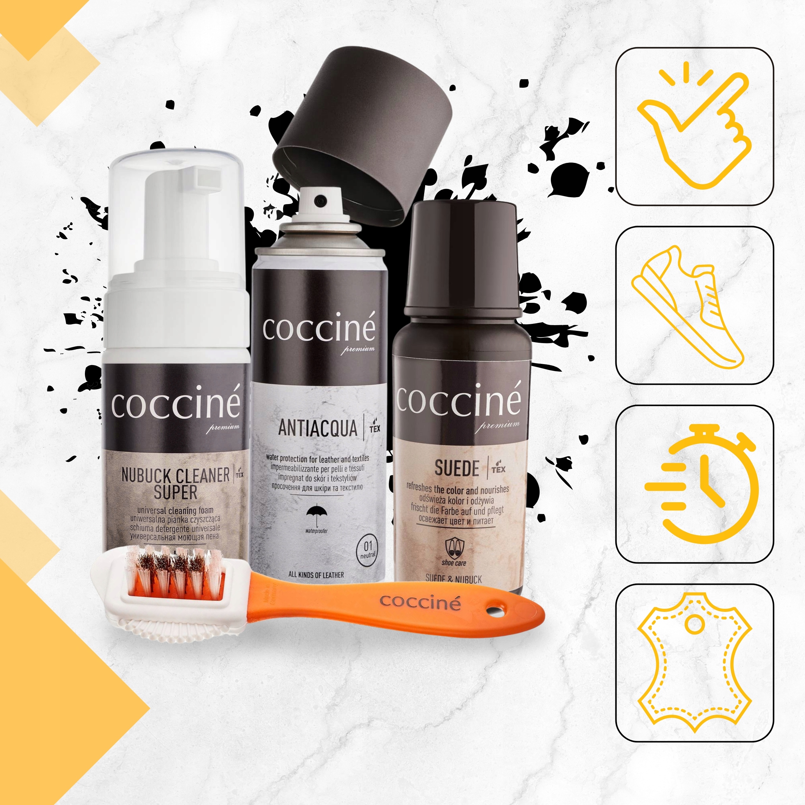 Просматривая «Уход и пропитка черных туфель от замшевого набора Nubuck Coccine 4in1», вы можете быть уверены, что данный товар из каталога «Наборы для ухода за обувью» будет доставлен из Польши и проверен на целостность. В цене товара, указанной на сайте, учтена доставка из Польши. Внимание!!! Товары для Евросоюза, согласно законодательству стран Евросоюза, могут отличаться упаковкой или наполнением.