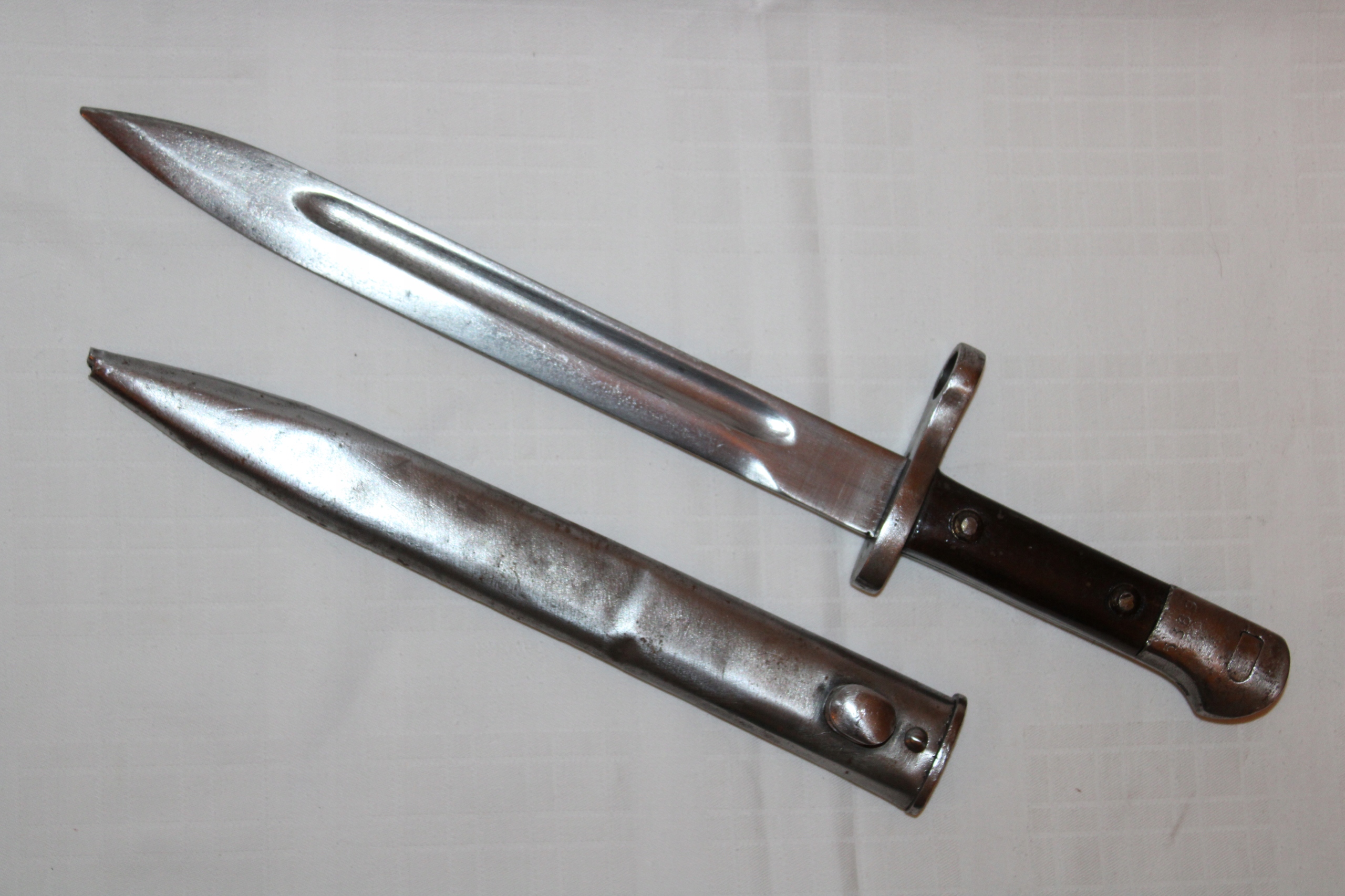 Турецкий штык для Маузера, номер головы, общий размер без влагалища 37,6 см. Нет мяча в конце влагалища. На лезвии двойной брони.