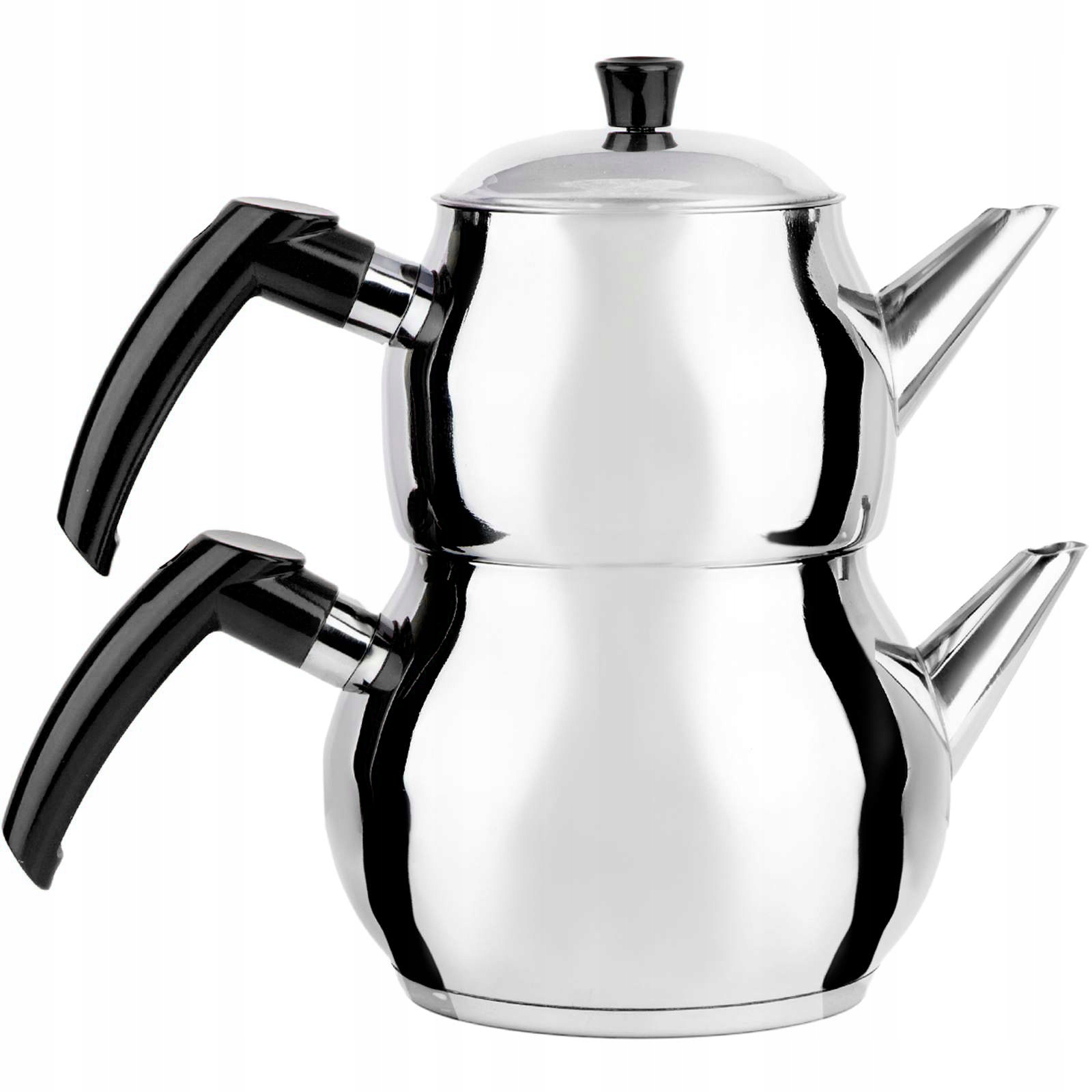 Турецкий чайник для приготовления чая был произведен с из нержавеющей стали 18/0 Cr. Нити Этот чайник будет размещать максимум 1L в нижней части и 0,65L в верхней части.