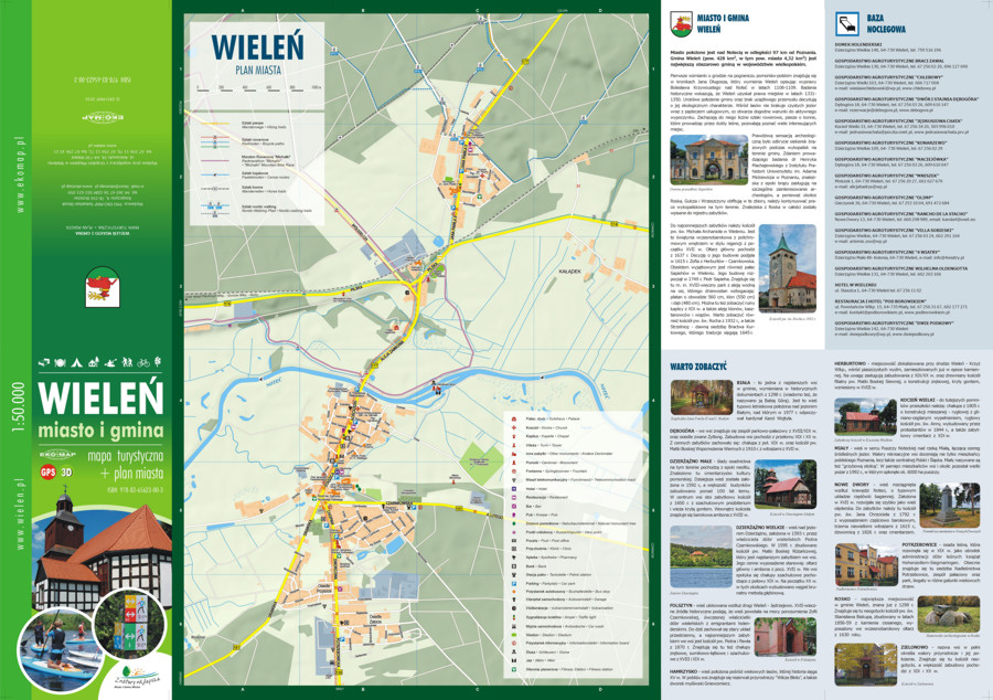 Картографическая часть: туристическая карта гмины Велень с прилегающими территориями, план города Велень, батиметрические карты, легенда на польском, немецком и английском языках.
