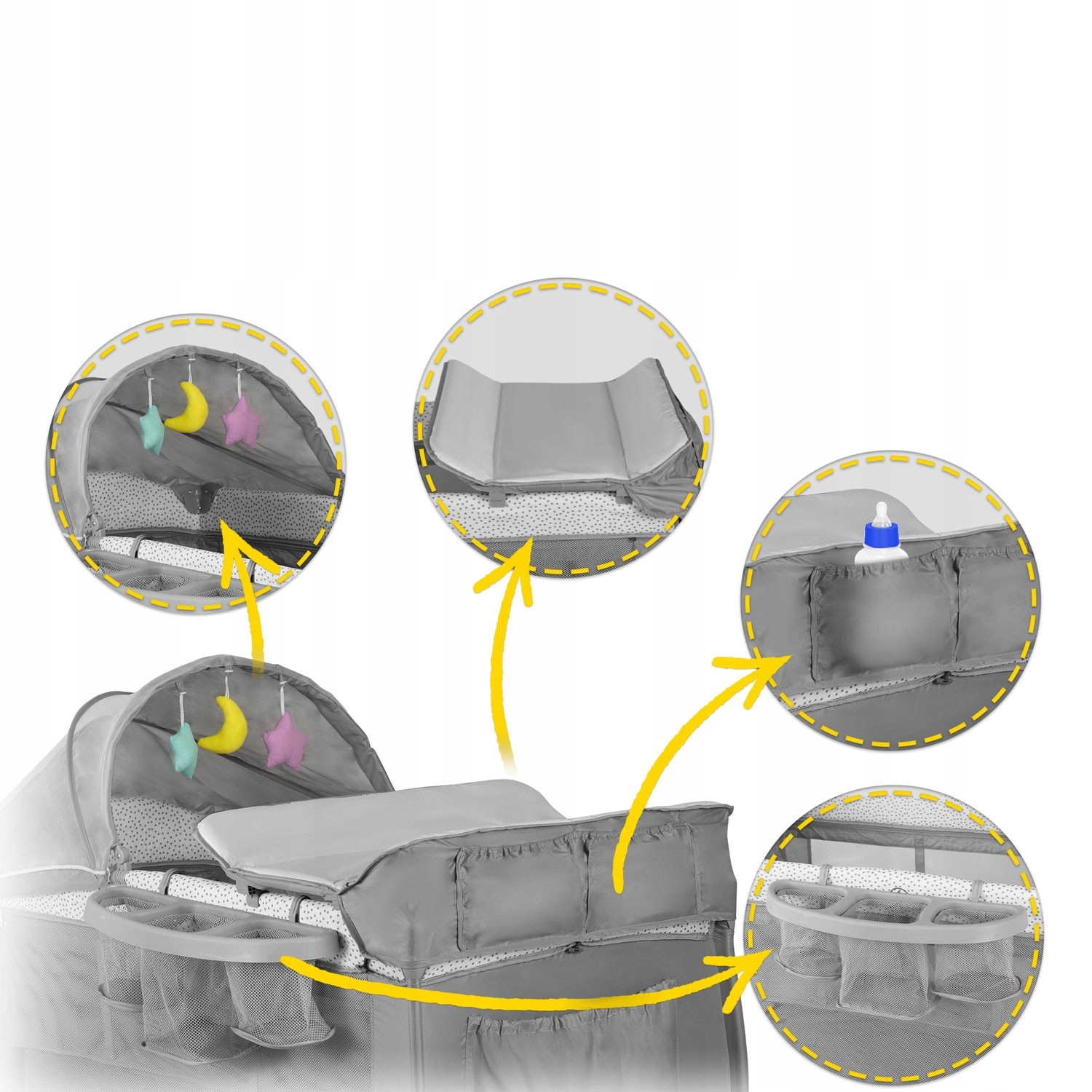 Вы можете прикрепить игрушки к крыше и переоборудованный столик, который может быть отстранен или оставить в сторону в любое время, используя его только в случае необходимости. Существует также организатор и карманы для вещей, необходимых для ухода за ребенком.