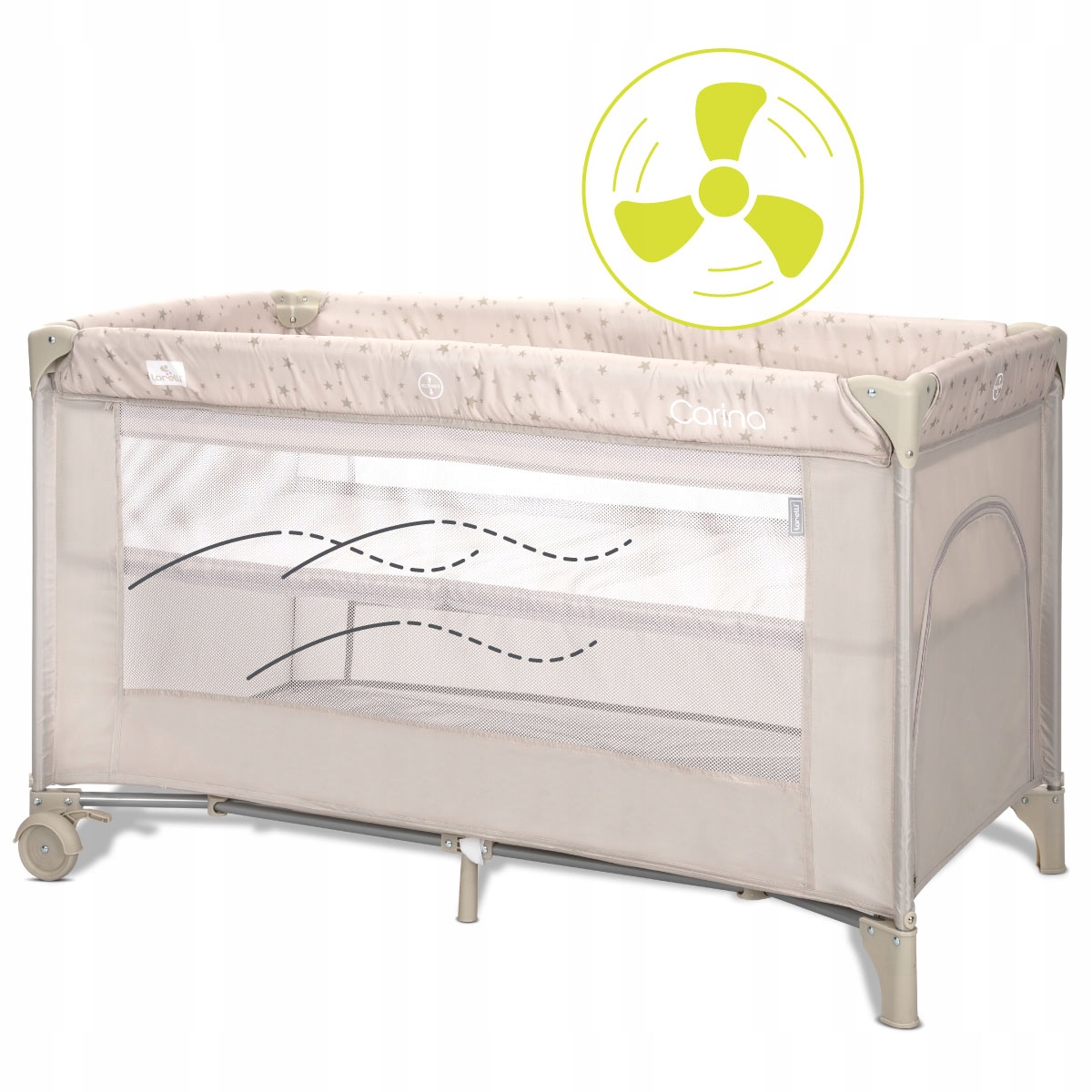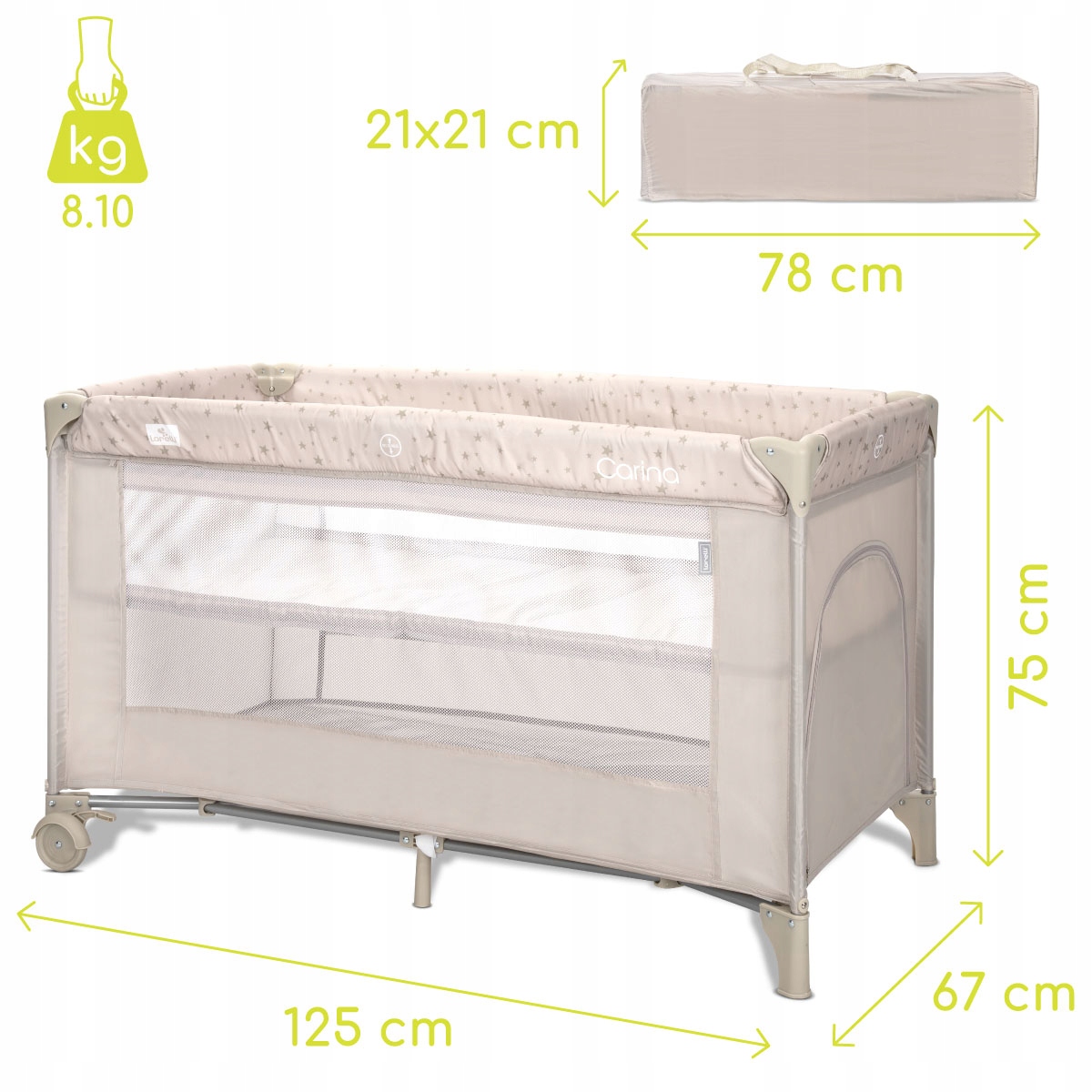 Lorelli Carina 2 - это туристическая кровать, предназначенная для выращивания с вашим ребенком - она предлагает два уровня регулировки позиции на матрасе и быстрого сборки. Благодаря большим колесам, сплошной строительной и транспортной сумке это будет идеально во время поездок и дома, обеспечивая мирное сон и комфорт.