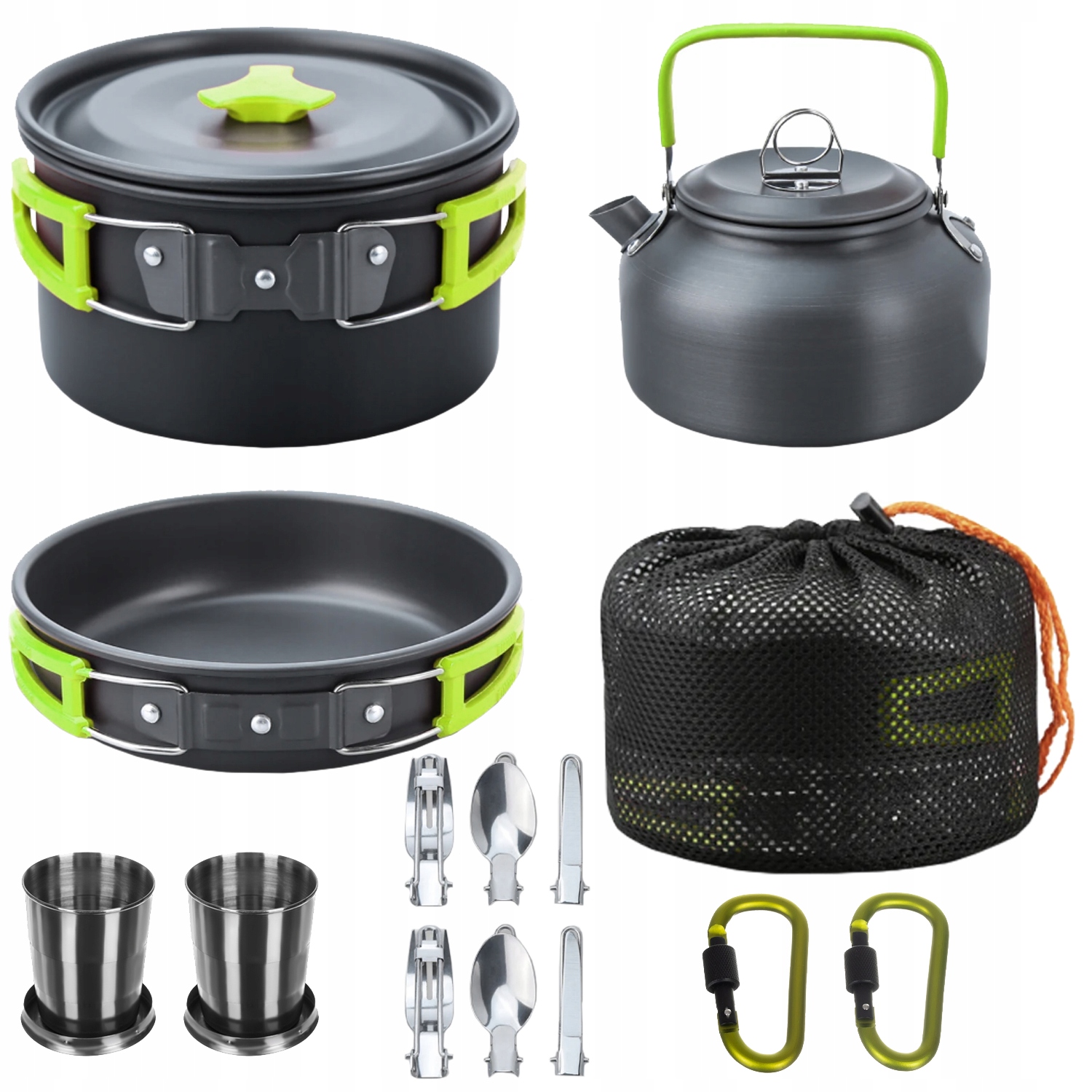 Кухонная посуда включают в себя множество элементов, включая горшок, чайник, 2 -кратный нож, вилка, ложка, 2 -кратный карабинер, 2 -кратная складная чашка, пакет для хранения. Набор портативной кухонной посуды также включает в себя сумки для столовых приборов.