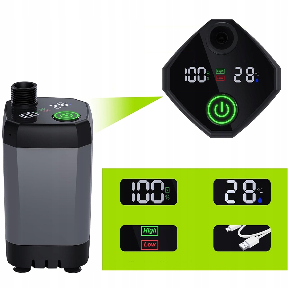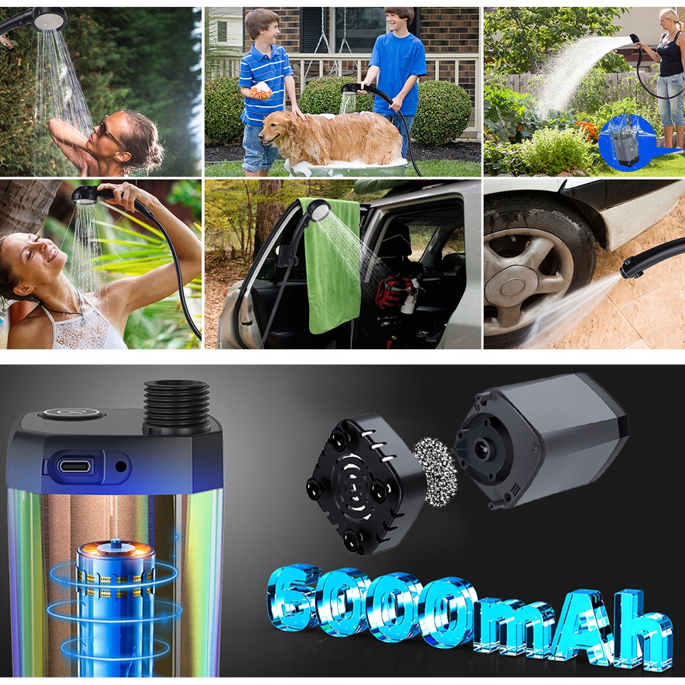 Портативный кемпинг имеет встроенную батарею в 6000 мАч, которая может работать непрерывно в течение 120-150 минут после полной зарядки. Портативный кемпинг душ с портом типа C его можно зарядить с помощью зарядного устройства для мобильного телефона (5 V-2 A), источника питания для мобильного телефона, ноутбука или USB-автомобиля, очень удобно. Уровень температуры и мощности, обеспечивая удовольствие от душа с умеренной температурой воды и после потребления энергии через насос для кемпинга. Портативный лагерь с насосом не может работать в воде выше 60 ° C / 140 ° F и не может производить горячую воду. ПРИМЕЧАНИЕ. Нет функции отопления