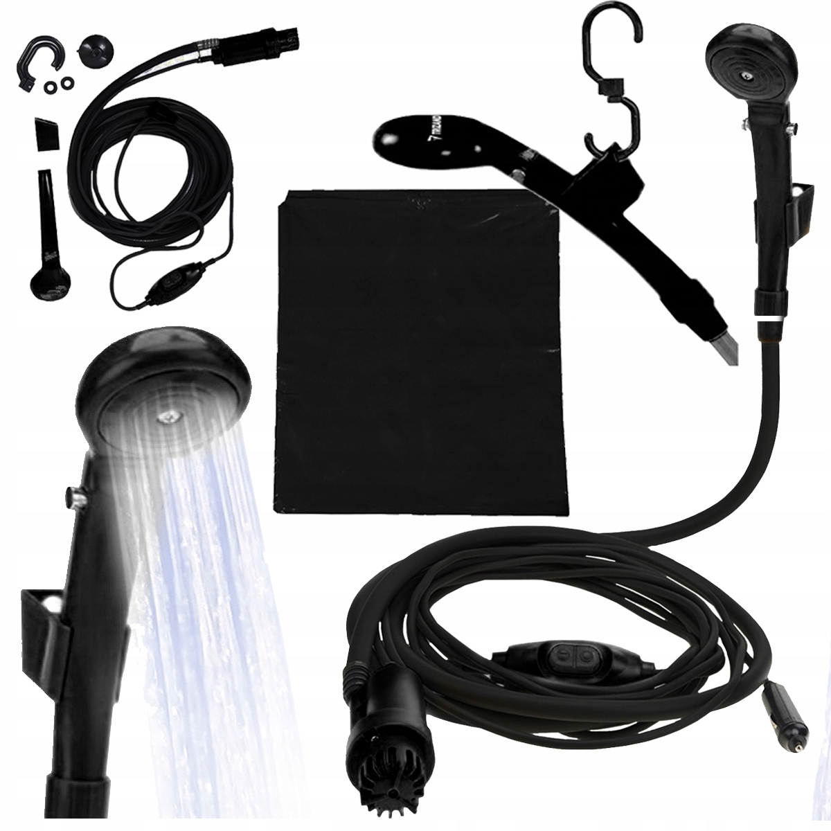 В душе используется высокопроизводительный насос производительностью 3,5 л/мин, поэтому струя воды будет равномерная и сильная. Просто подключите кабель к автомобильной вилке.