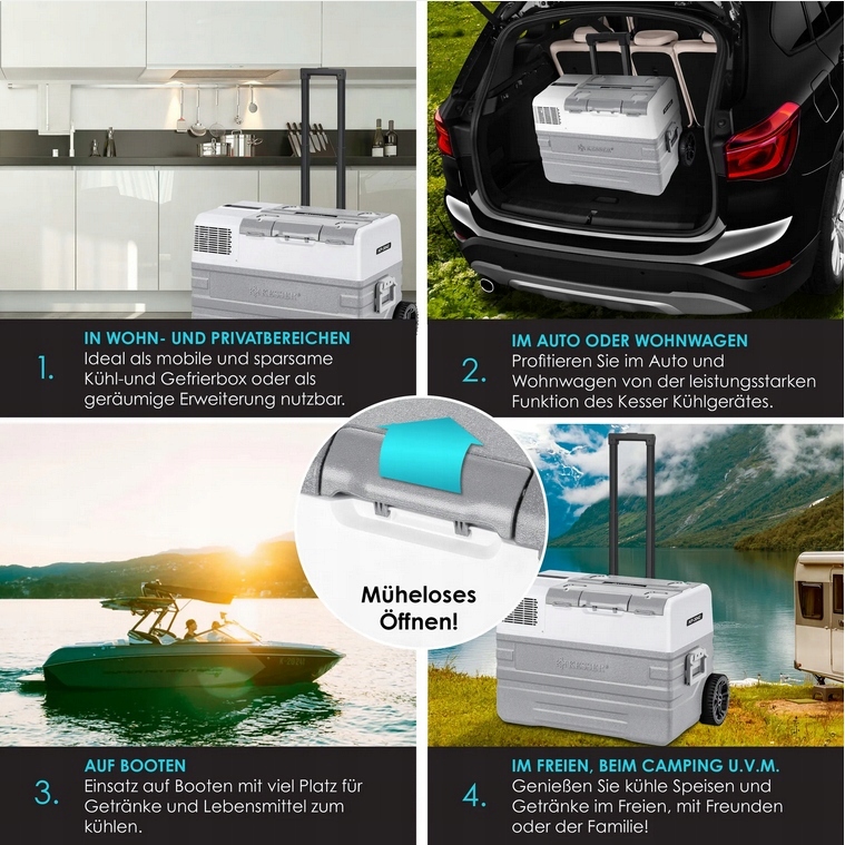 ✅ Компрессор Кессера идеально подходит для поездок и кемпингов. Благодаря компактному размеру, большой емкости, твердым колесам, регулируемой телескопической ручке и автомобильной розетке (DC) вы готовы к приключениям! Благодаря встроенному охлаждению, вы забудете о классических охлаждающих патронах. Функция напоминания температуры обеспечивает контроль над охлаждением.