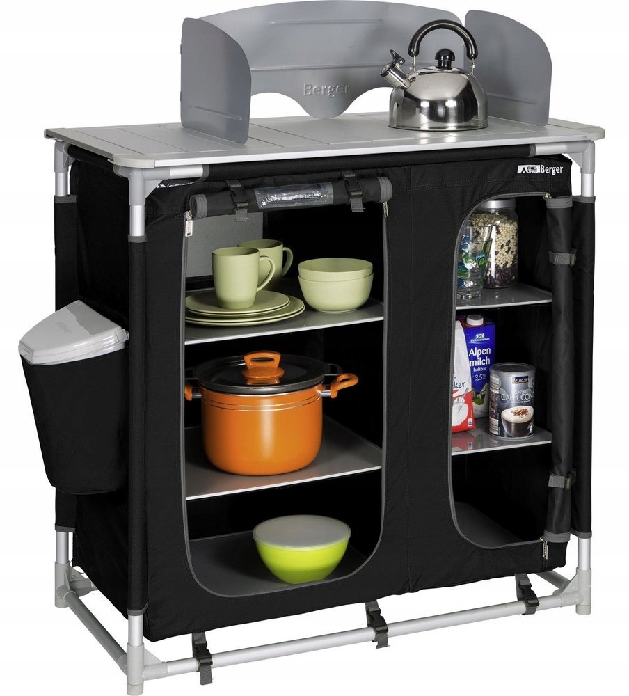Складной дорожный шкаф Berger — идеальное решение для кемпинга или походов с палаткой. Изготовлен из высококачественных материалов, легко чистится, быстро собирается и имеет стабильную и прочную конструкцию. Оснащен вместительными шкафами, позволяющими хранить необходимые вещи, такие как посуда и кухонный инвентарь. Столешница с местом для плиты гарантирует комфортное приготовление еды на свежем воздухе благодаря ветрозащите. Кроме того, шкаф оснащен боковым карманом для размещения мусорной корзины, чтобы она была под рукой. Алюминиевые ножки с регулировкой по высоте гарантируют устойчивость даже на неровных поверхностях. Шкаф можно разложить всего за несколько шагов, а благодаря удобной сумке транспортировать шкаф очень удобно. р>