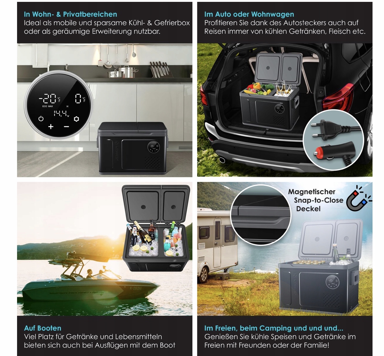 Compressor 2IN1 Compressor Kesser® - холодильник и морозильник, 40L, охлаждение до -20 ° C, 12 В/ 24 В и 230 В. две зоны Вы можете охладить напитки и еду в одном и заморозить других во второй зоне. Идеально подходит для автомобилей, туристов, лодок и всех мероприятий на свежем воздухе. - двойная зона : охлаждение до 0 ° C и замораживание до -20 ° C .