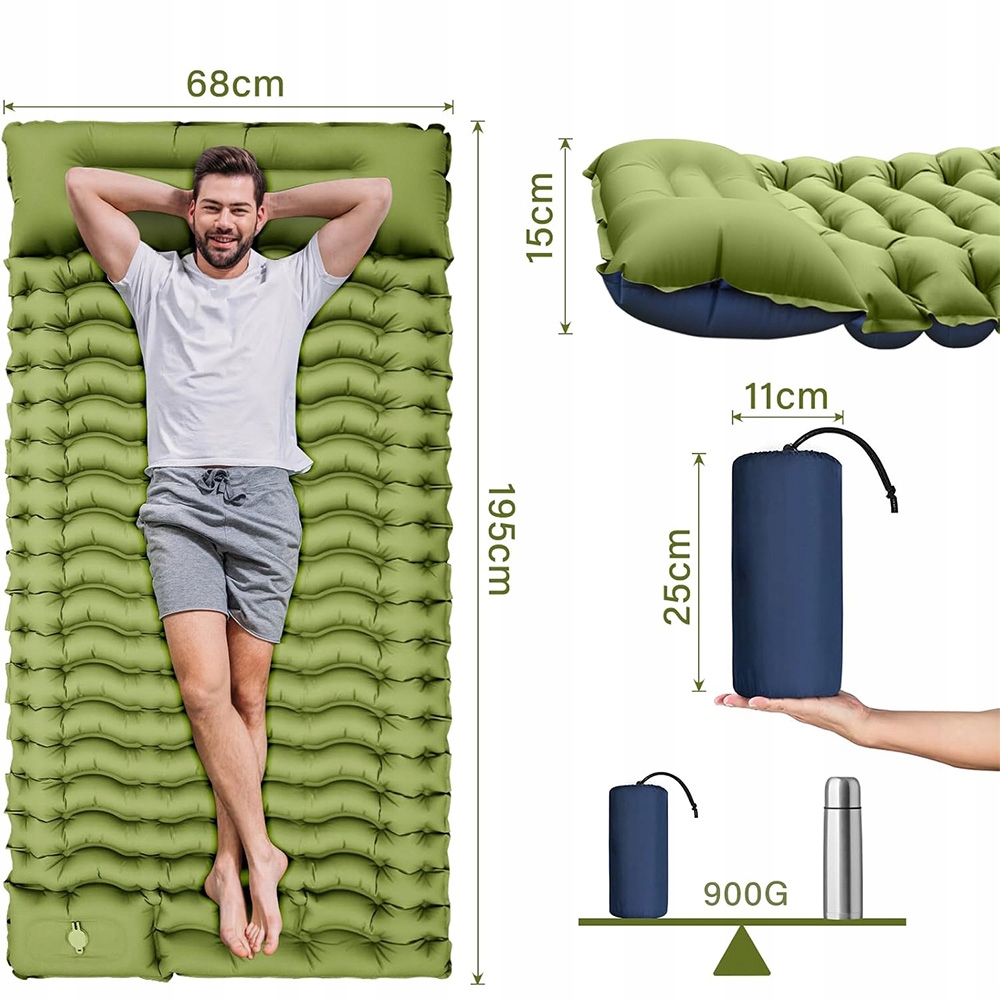 Ультра -светлый самостоятельный матрас весит всего 800 г, а после складывания он имеет размер бутылки с водой. Благодаря встроенной подушке вы можете сохранить дополнительную подушку. Он легко вписывается в рюкзак, который идеально подходит для походов, кемпинга, поездок на рюкзак, путешествий, скалолазания, походов и других мероприятий на свежем воздухе.