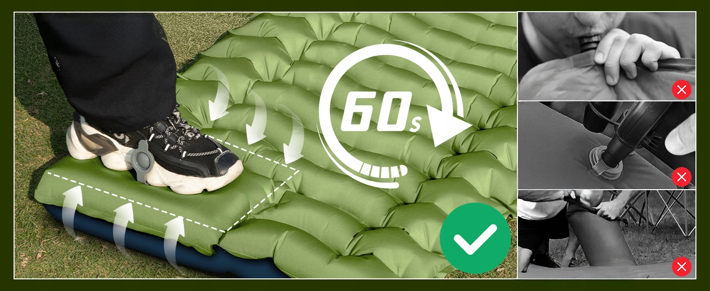 ⏺- Вы можете надуть его, стоя на одной ноге на интерфейсе насоса, и это требует всего 1 секунду, сохраняя ее, сохраняя ее только энергию. Благодаря улучшенной версии выпускного клапана с мембраной без утечек вам больше не нужно беспокоиться о утечках.