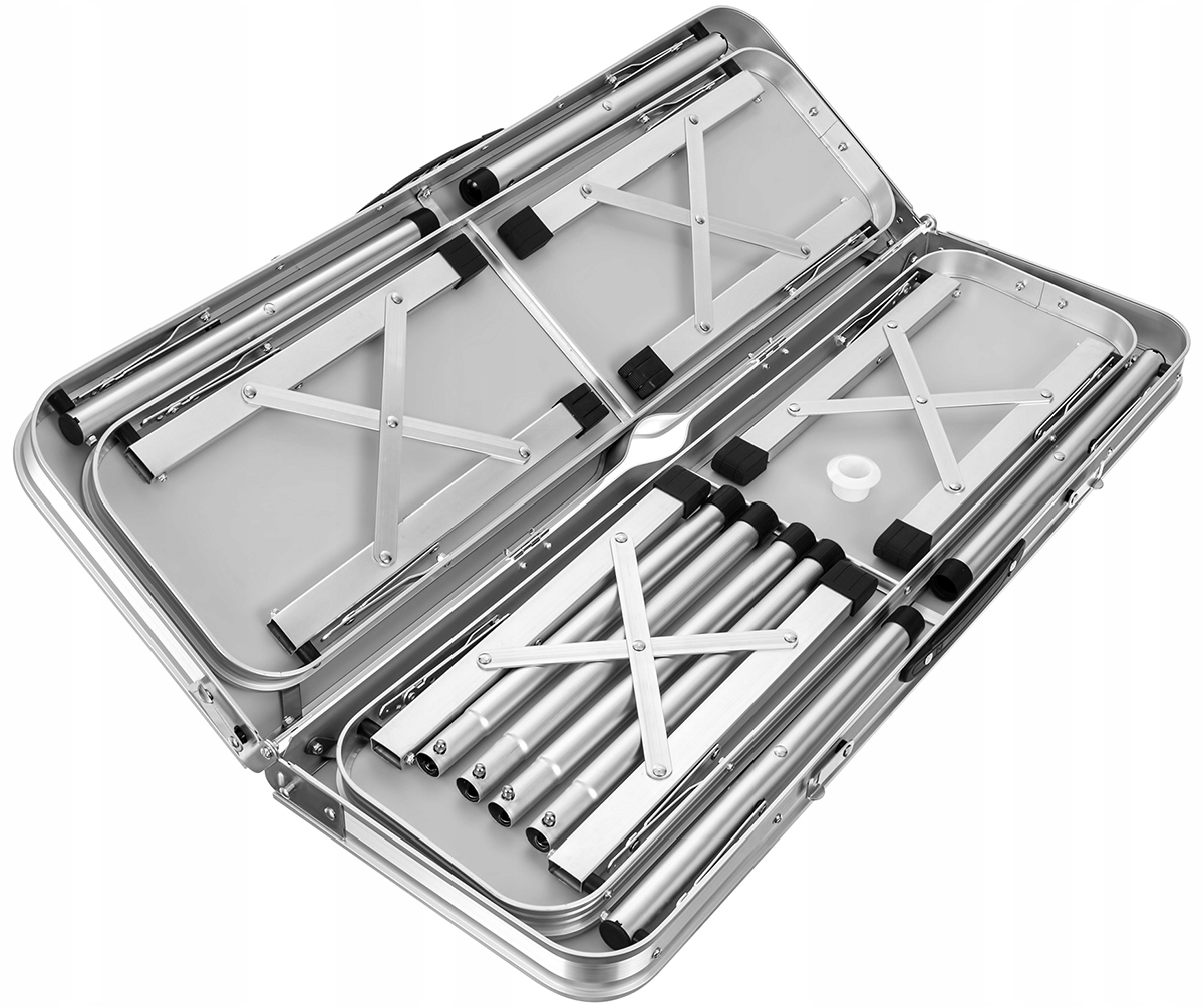 Комплект собирается и собирается менее чем за минуту, достаточно открыть чемодан, снять и разложить скамейки, разложить ножки и закрепить. Комплект складывается в чемодан, в который можно спрятать скамейки.