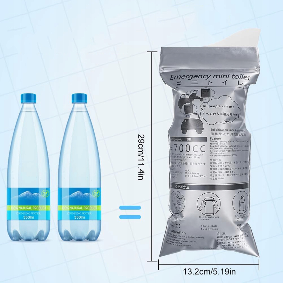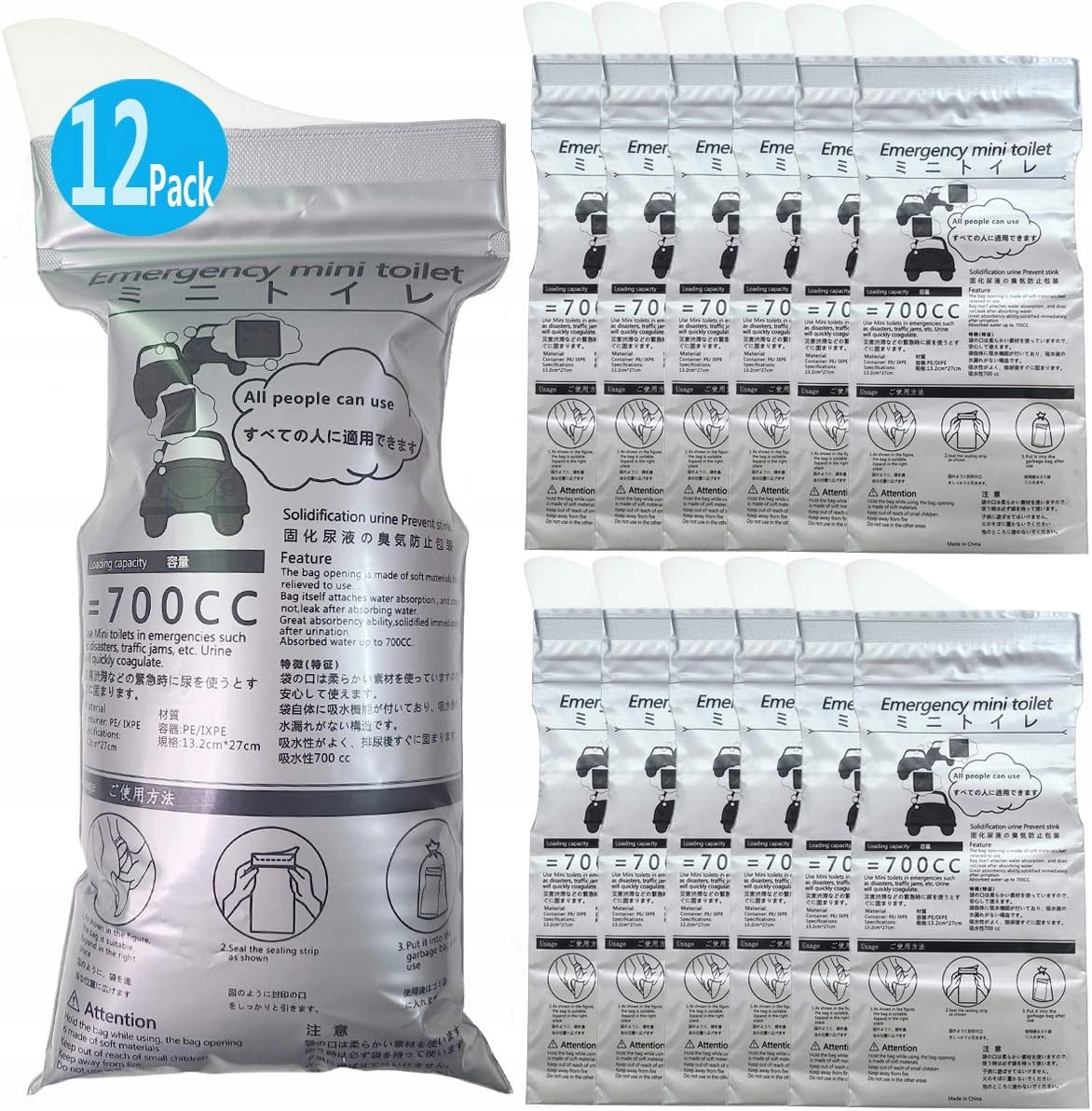 Вы получите 12 пакетов мочи с размерами около 13,2 x 29 см и емкостью 700 мл, идеально подходящие в внезапных случаях или ситуациях, в которых использование туалета нелегко.