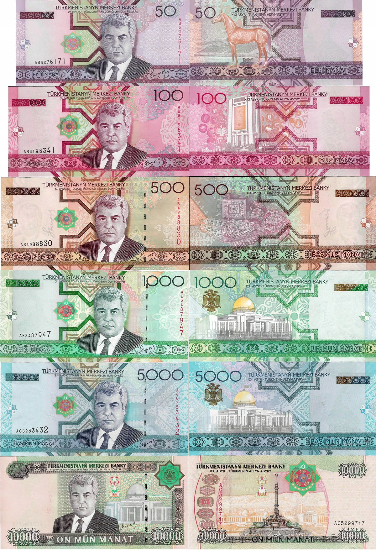 Turkmenistan 2005 zestaw 6 szt 50+100+500+1000+5000+10000 manat P.16-21 UNC