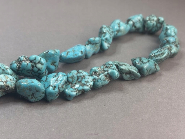 Turkmenit-это камень с размерами около 1,5-2 см. Это окрашенное разнообразие Howlite, которое имитирует бирюзовую и восхищение своим характерным, глубоким цветом. Идеально подходит для ювелирных изделий, особенно в проектах, требующих бирюзового акцента