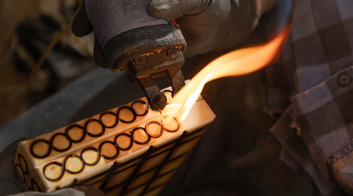 Линии, отделяющие светлые поля от темных, выполнены путем выжигания раскаленной проволокой. Темные участки прокрашиваются морилкой вручную.