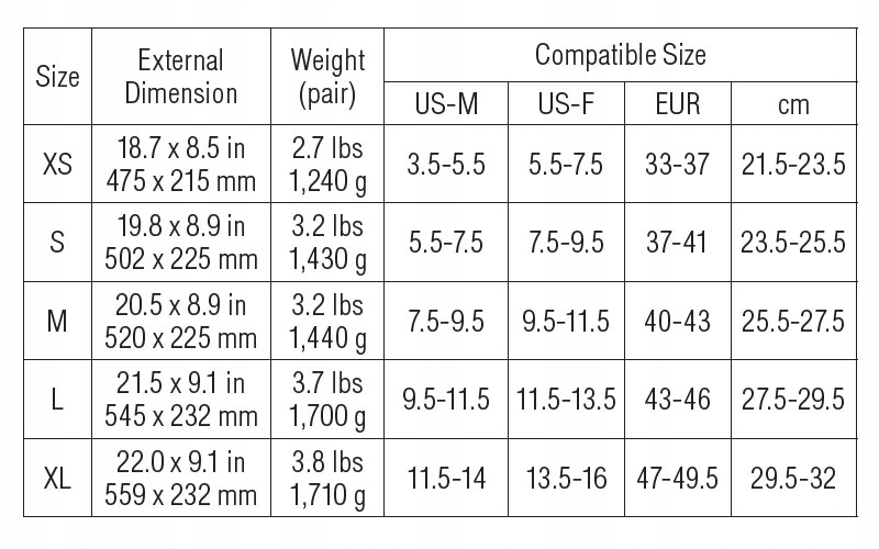 <ул>Размеры, вес плавников и рекомендуемая длина стопы указаны в таблице на рисунке ниже