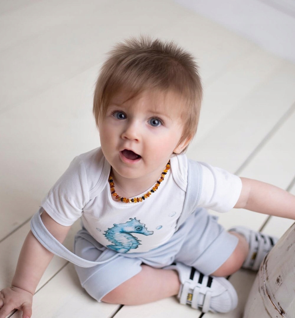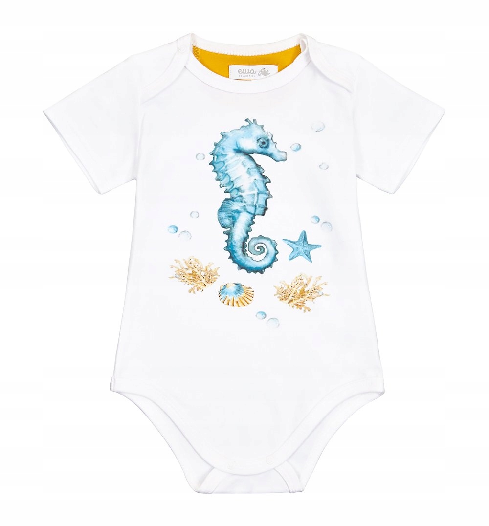 Белое, универсальное тело с короткими рукавами, вшитыми в Польше, с высоким качеством хлопка. Материал очень мягкий и приятный для кожи ребенка. Вырез «на вкладке» - очень простой и быстрый способ одеть младенца. Прессы, вшитые в промежности, не являются несущими и анти -аллергическими. Красочный рисунок в морских лошадях вводит малыша в красивый, подводной мир и прекрасно вписывается в одежду в каждом цвете.