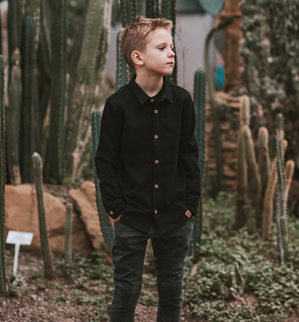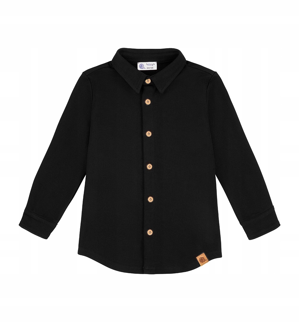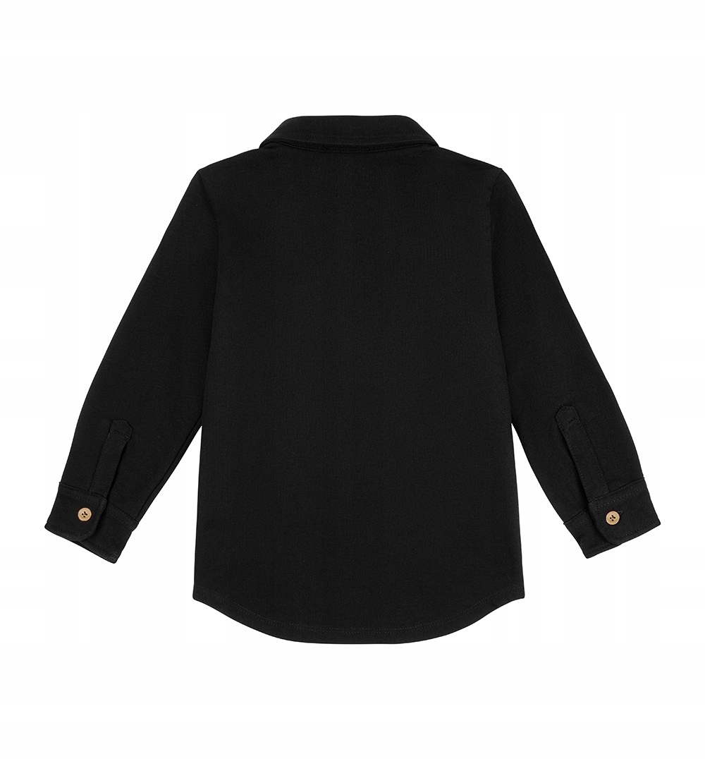 Классическая черная рубашка для мальчиков польского производства из высококачественного хлопка лакоста. Это материал, который немного жестче традиционного хлопка для свитшотов, благодаря чему рубашка сохраняет красивую форму и при этом выглядит элегантно. Однако на комфорте малыша это не влияет. Материал приятен на ощупь и очень удобен в носке. Рубашка простой формы, застегивается на деревянные пуговицы. Это отличное решение как для официального, так и для повседневного стиля.