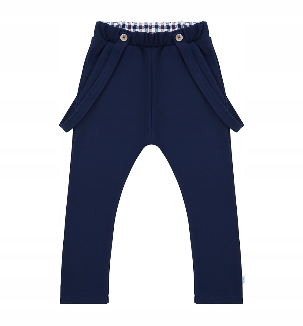 Темно-синие спортивные штаны производства Польши из мягкого хлопка. Брюки очень элегантные и стильные, и в то же время очень удобные и приятные на ощупь. Мягкий материал обеспечивает младенцам максимальный комфорт при ношении. Брюки имеют два открытых кармана спереди и подтяжки, застегивающиеся на декоративные деревянные пуговицы. Такие простые темно-синие брюки хорошо смотрятся в официальном стиле в сочетании с элегантной футболкой.