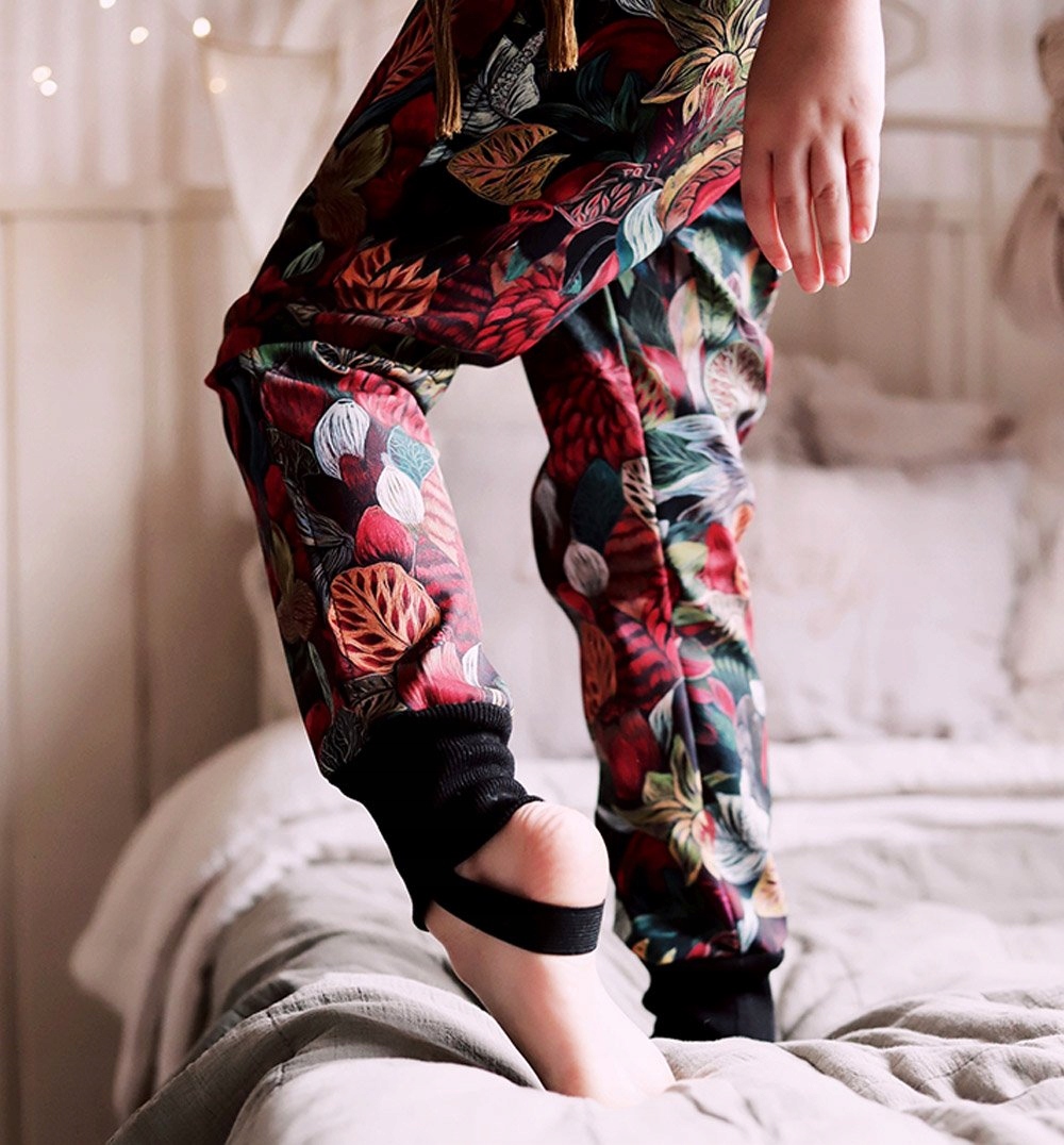 Мягкий хлопковый пояс толстовки с резинкой и регулируемым шнурком предотвратит скольжение брюк, а эластичные манжеты на ногах с резинками предотвратит выскальзывание брюк из обуви. Модель также имеет слегка завышенную талию. Все это для того, чтобы обеспечить безопасность и комфорт вашего малыша на самом высоком уровне. Красивый мотив из листьев станет прекрасным дополнением вашего образа в холодные пасмурные дни.