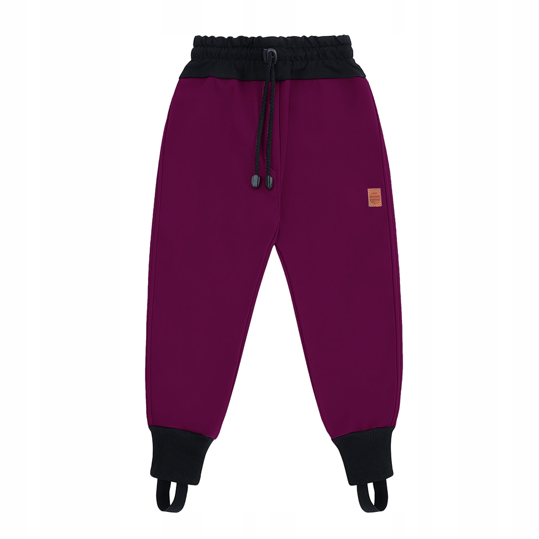 Детские брюки из софтшелла темно-фиолетового цвета. Этот практичный, ветрозащитный материал, идеально подходящий для переходных сезонов, состоит из трех слоев: