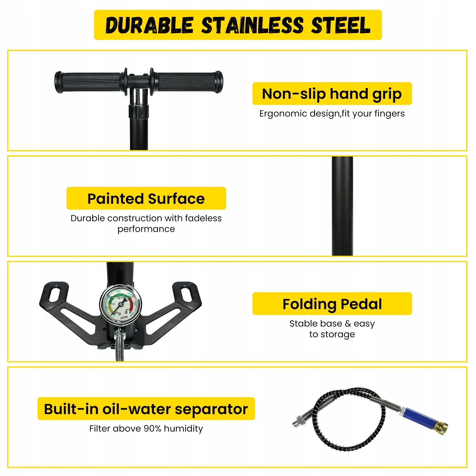 Убедитесь, что герметичность перед использованием. Проверьте стеснение между мягкой трубкой и воздушной базой. Убедитесь, что высокая плотность между разъемом и шиной, чтобы избежать утечки. Надувая 30 раз, чтобы смазать внутреннюю стену воздушного насоса. Затяните корпус насоса с помощью основания. Используйте нефть, если есть утечка ANA Air. Особенности инновационных складных ног для легкого хранения