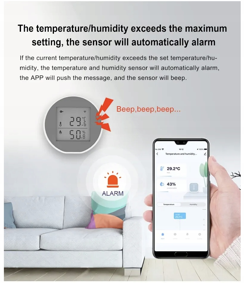 Сигнализация высокой и низкой температуры/влажности: Когда температура/влажность превышает установленное значение, устройство издает звуковой сигнал. на месте раздастся звуковой сигнал о капельнице, и на телефоне отобразится сигнал тревоги.