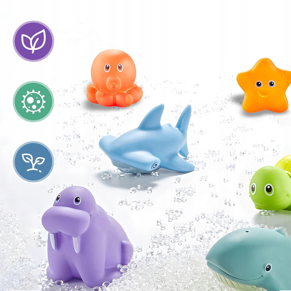 игрушки для ванной изготовлены из резины и АБС-пластика, устойчивы к коррозии и ударам, с гладкой поверхностью, мягкие и удобные, детям легко их брать и играть.