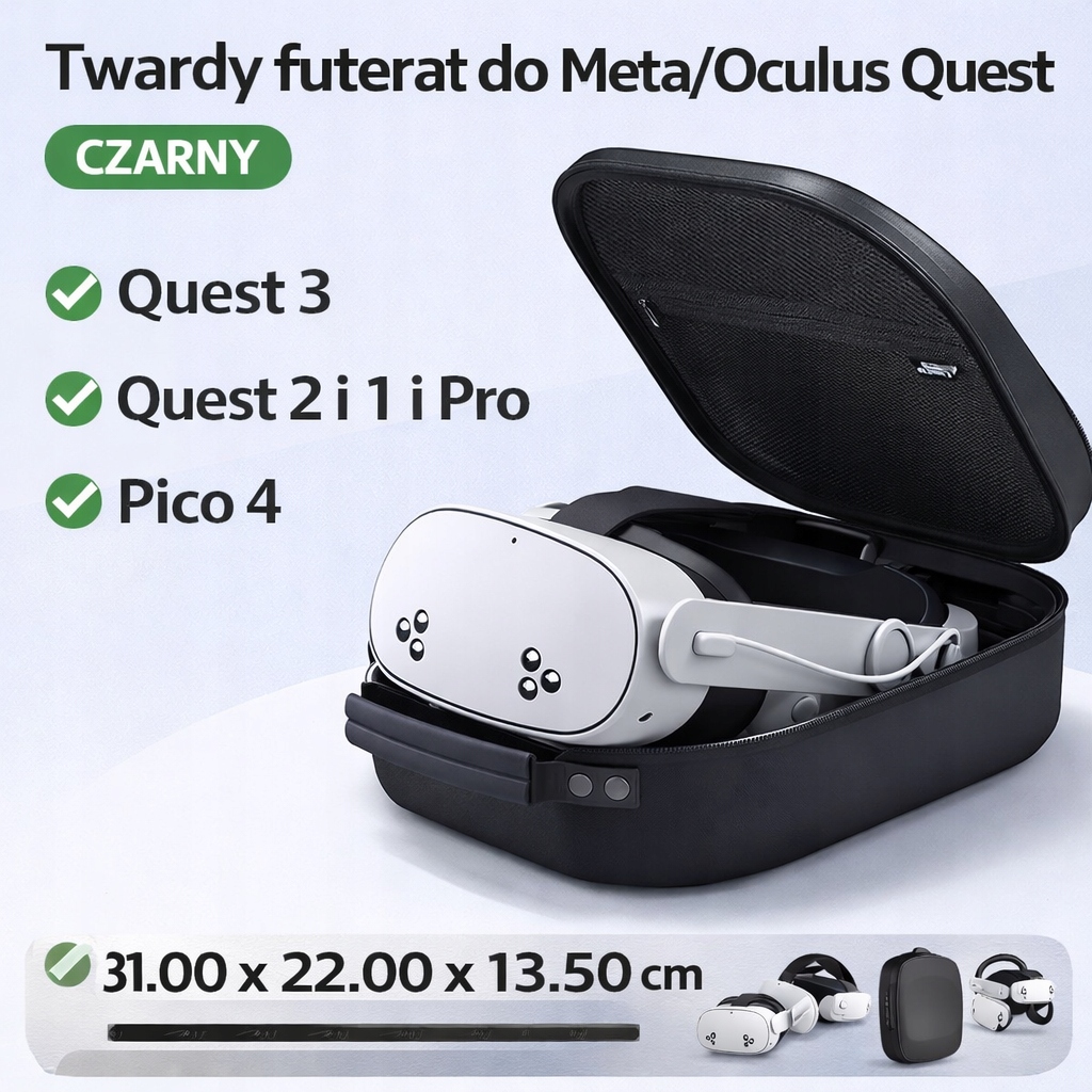 Одним из самых больших преимуществ этой модели является ее универсальность. Размеры футляра (31,00 x 22,00 x 13,50 см) оптимизированы для соответствия большинству современных очков виртуальной реальности, доступных на рынке. Вы можете легко разместить Meta Quest 3, Quest 2 (даже с установленным ремешком Elite), старые модели Oculus Quest 1, профессиональные очки Meta Quest Pro и конкурентоспособное решение Pico 4. Это делает этот продукт идеальной инвестицией, которая останется полезной даже после замены очков на более новую модель.