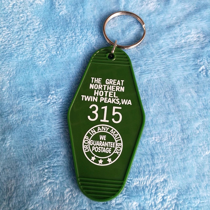 Подвеска-ключ в стиле серии Твин Пикс, из зеленого пластика с двухсторонним белым принтом, ширина кулона ок. 4,5 см, высота ок. 9 см.