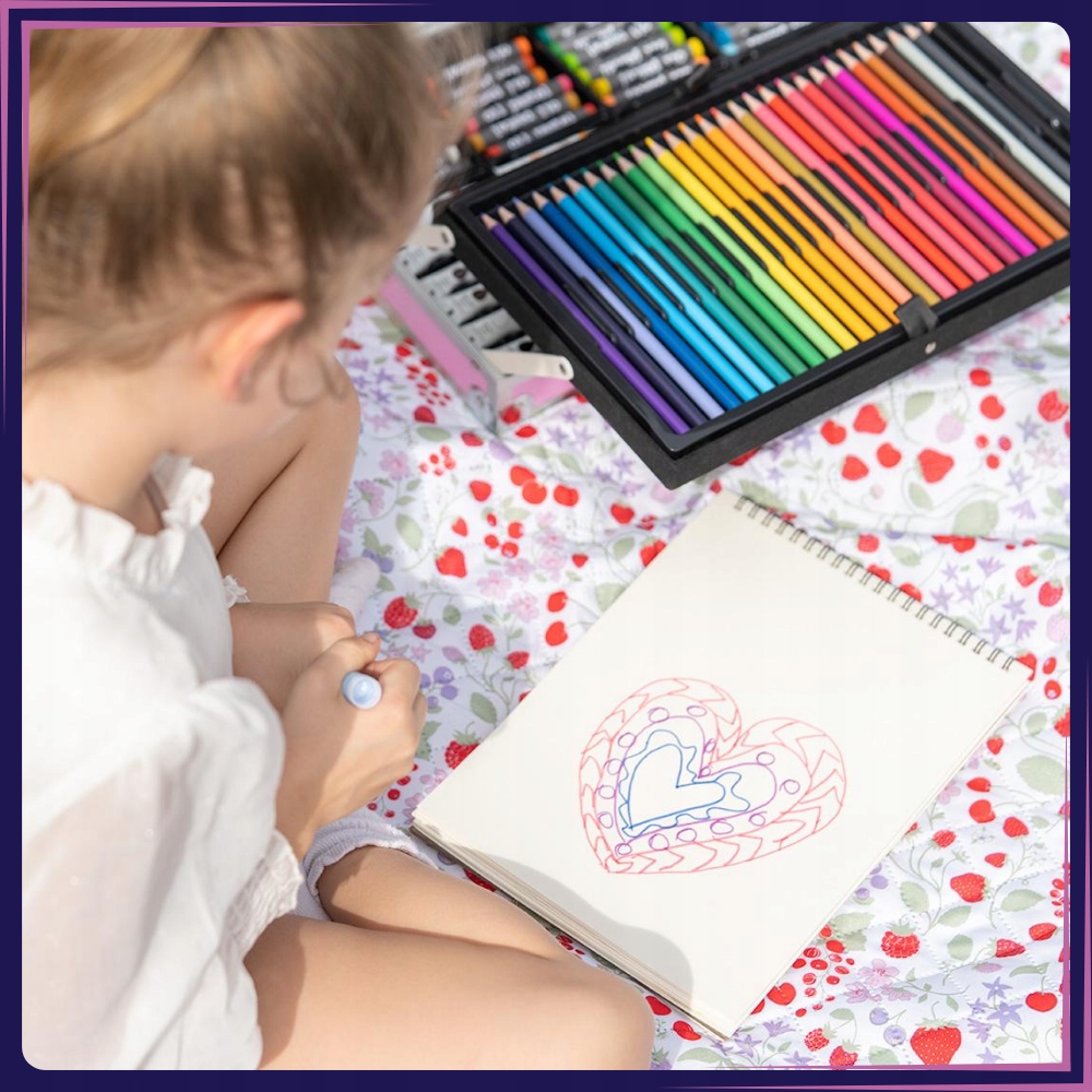 Художественный набор представляет собой широкий выбор аксессуаров для рисования и рисования, заключенных в эстетичный чехол для переноски.