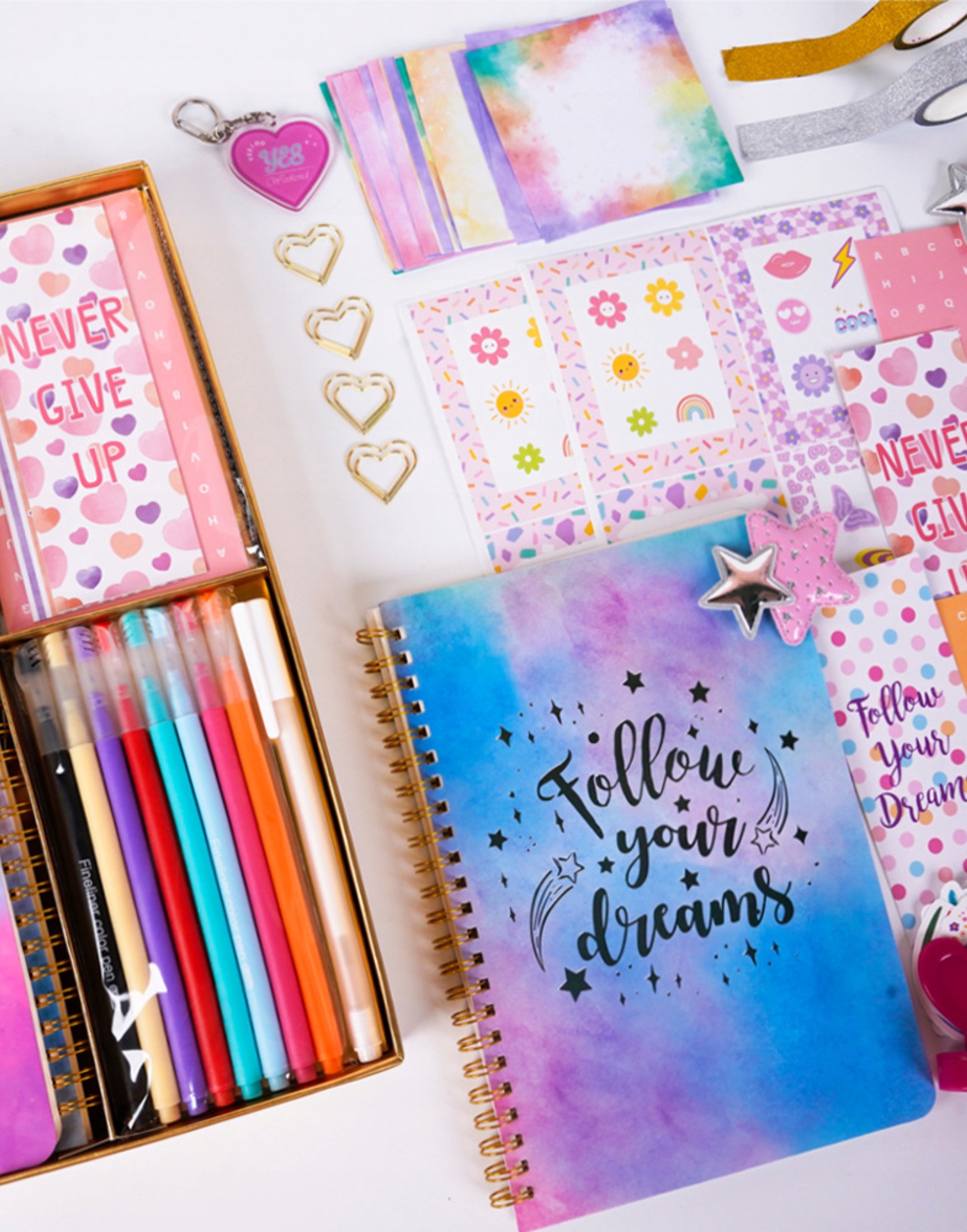 Пустые страницы блокнота способствуют письму, рисованию или ведению дневника. Яркие аксессуары позволяют создавать дизайны, соответствующие вашему стилю и настроению. Это практичный набор, сочетающий в себе эстетику, функциональность и свободу творчества.