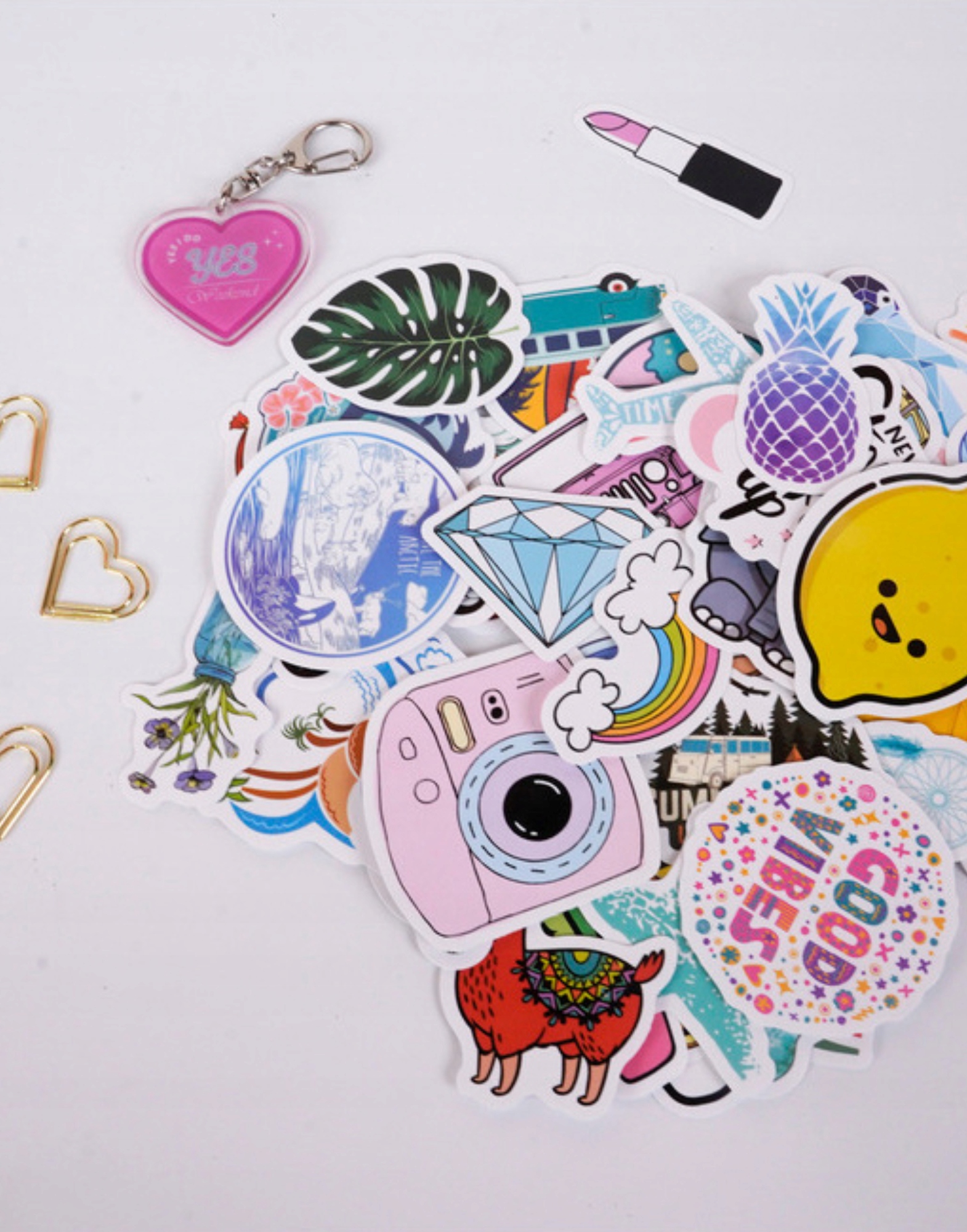 - Различные аксессуары — наклейки, ручки, блестящие ленты и украшения в одном наборе.
