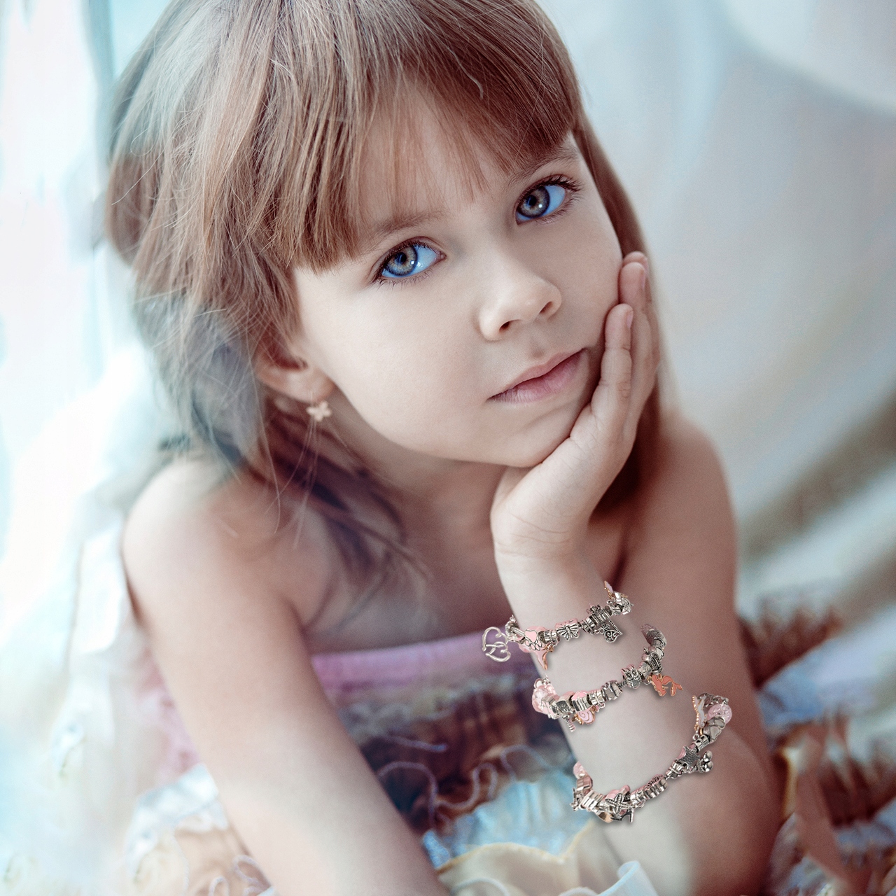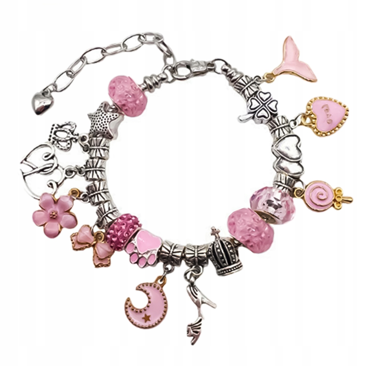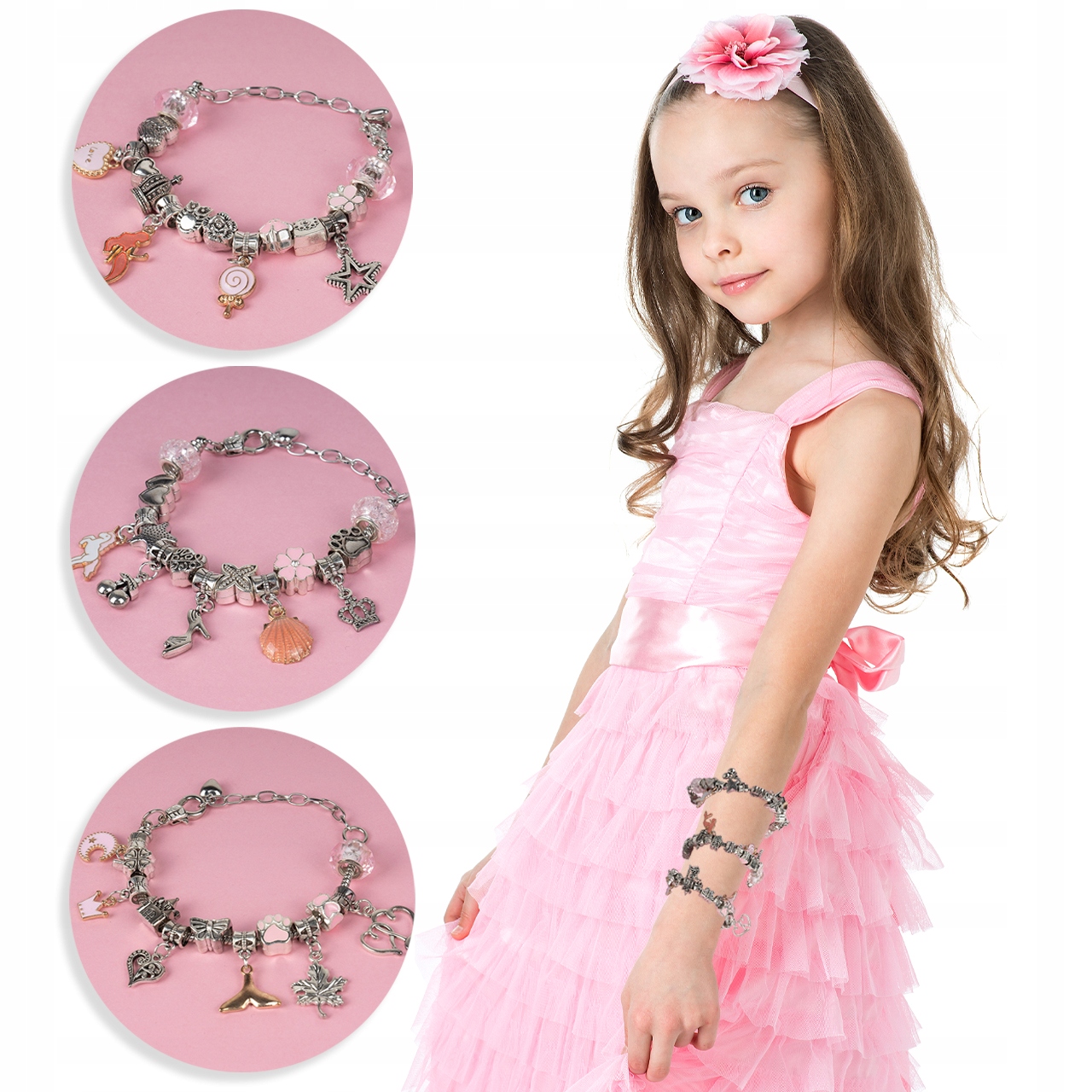В набор входят стеклянные, смоляные и металлические бусины различной формы, а также металлические бусины с различными подвесками. Все элементы можно нанизать на один из трех браслетов, длина которых регулируется.